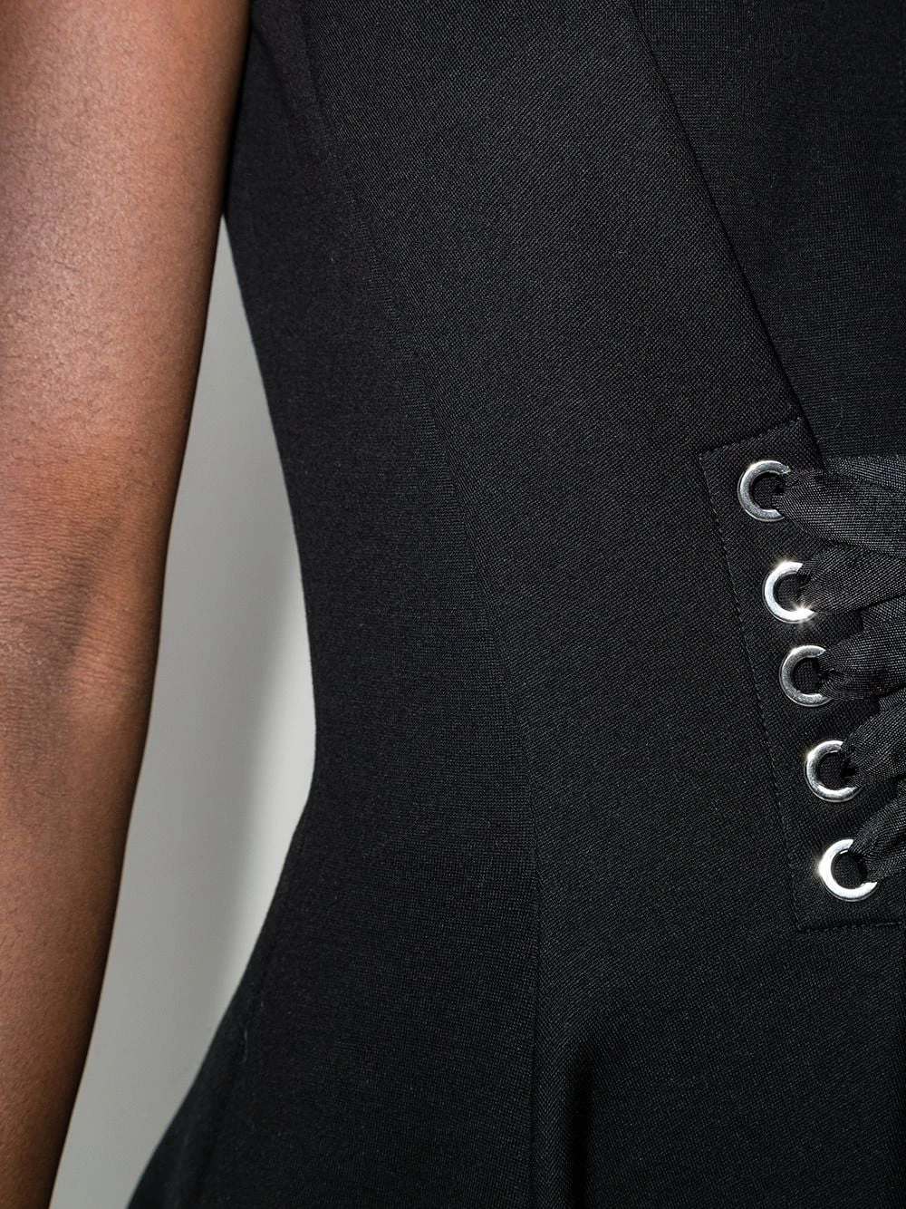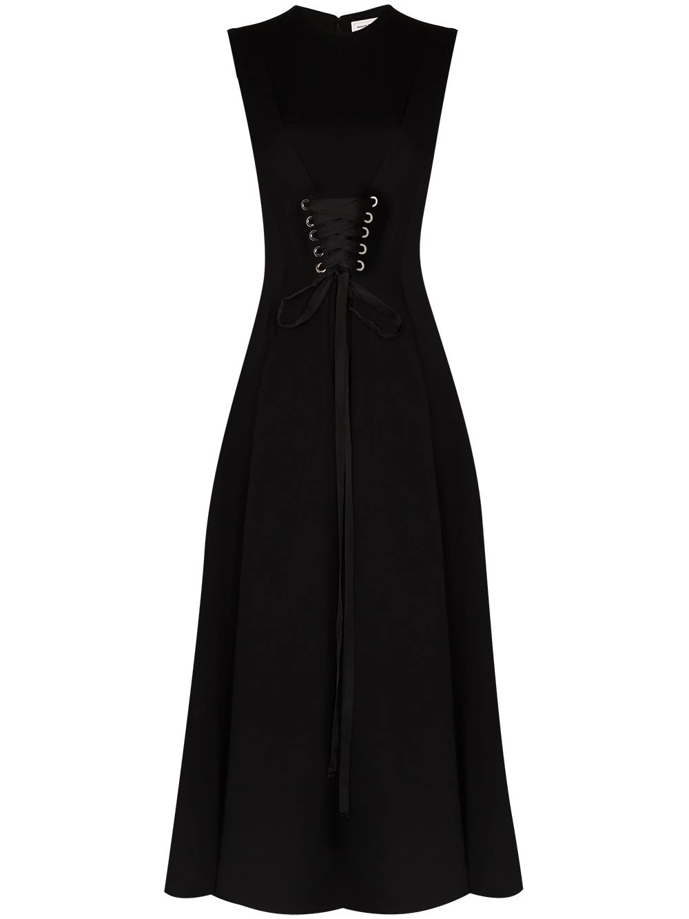 Evoking Alexander McQueen’s theatrical aesthetic, this mid-length dress features a corset-style lace-up fastening at the front and a flared silhouette that elevates its all-black design.ย