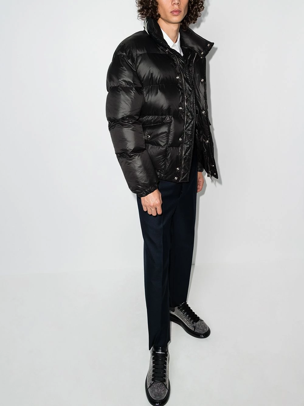 Alexander McQueen founded his namesake label in 1992 and became synonymous with a darkly alluring aesthetic that fed into McQueen’s anarchistic sensibilities. Produced in Italy, this short puffer jacket is detailed with a rear graffiti logo print at the back of the neckline.