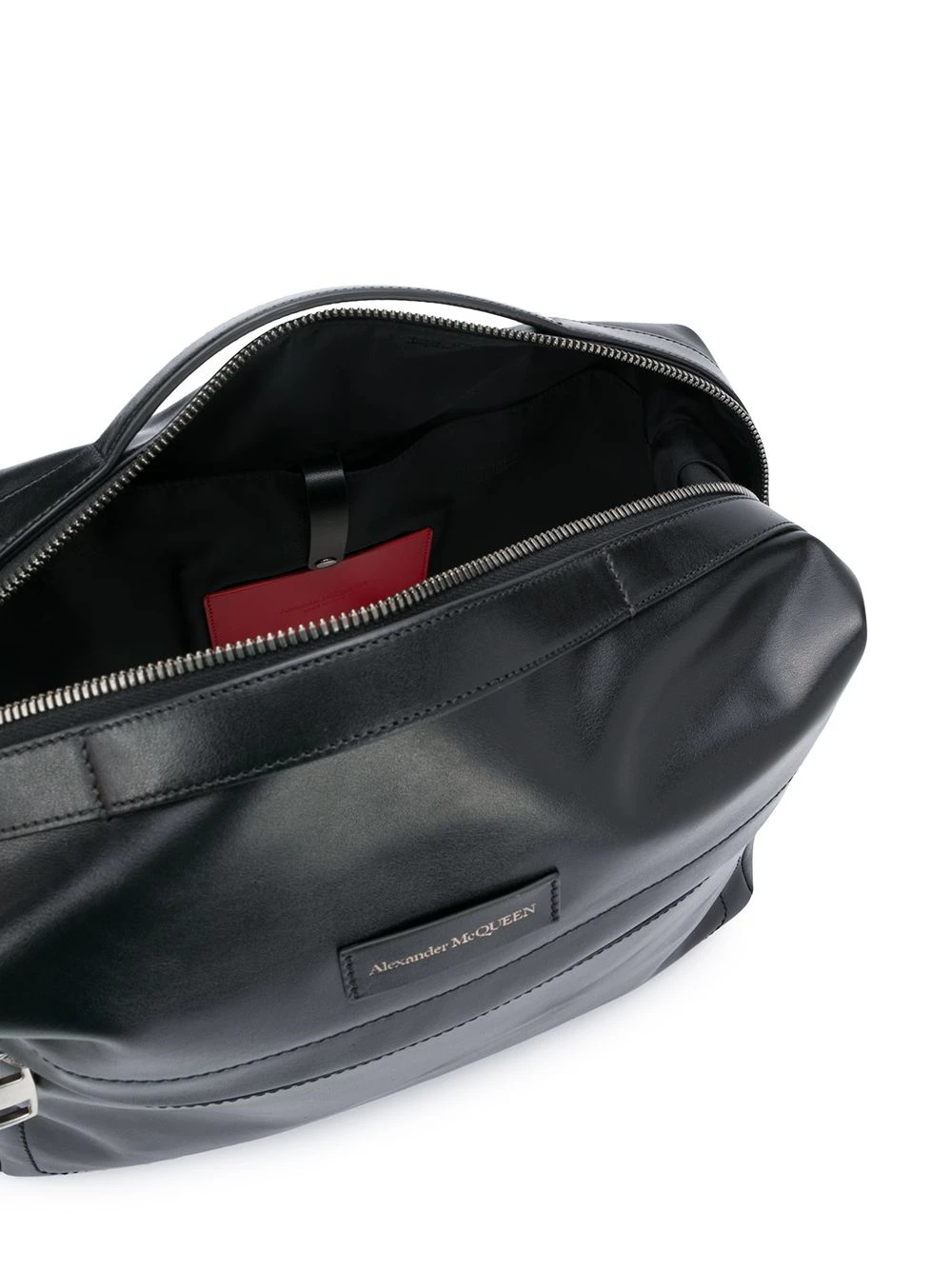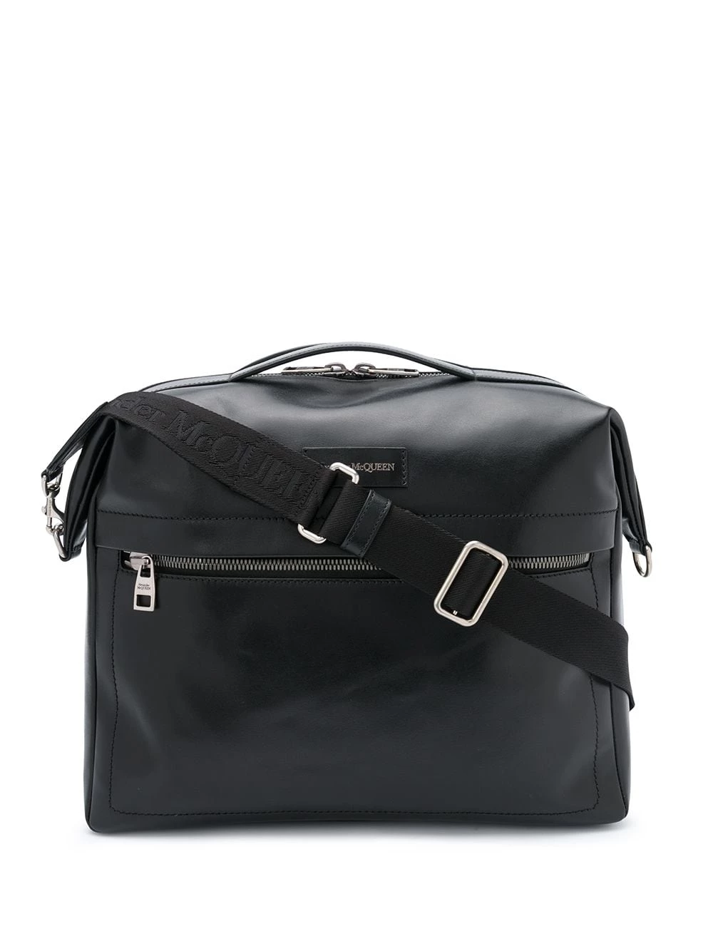 Black leather logo-patch tote bag from Alexander McQueen featuring logo patch to the front, top zip fastening, two rounded top handles, adjustable detachable shoulder strap, logo shoulder strap, front zip-fastening compartment and internal card slot.