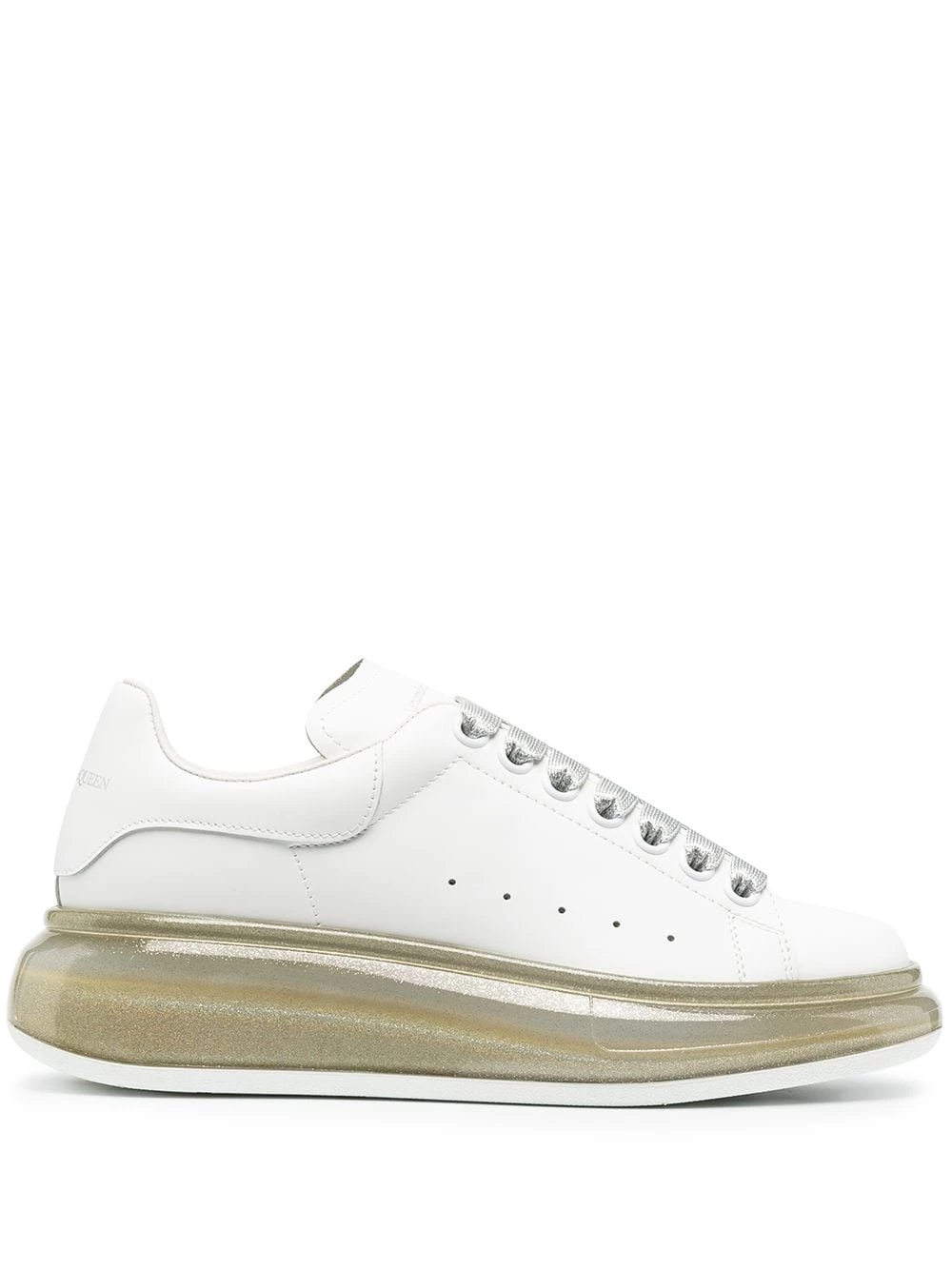 Chunky sneakers continue to have a major moment. Treat yourself to these oversized-sole sneakers from Alexander McQueen, finished with a branded heel counter and set atop a glittered rubber sole. Bigger is better.