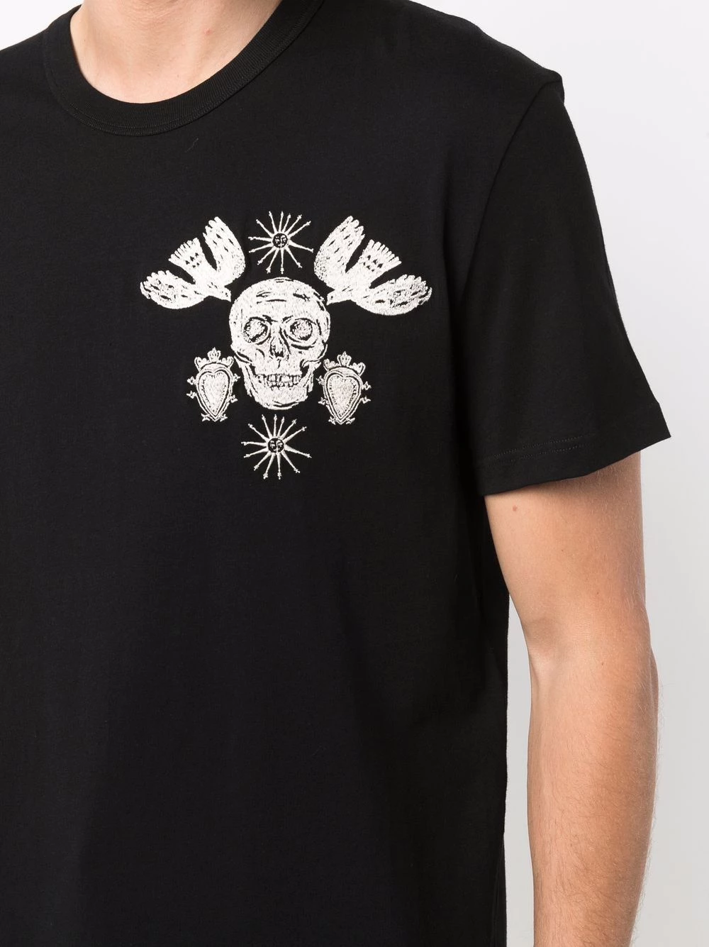 This AW21 under Sarah Burton’s creative direction, Alexander McQueen’s latest collection is decorated with hearts, doves and sun motifs. All three insignias can be found in a contrasting white print on this black T-shirt.