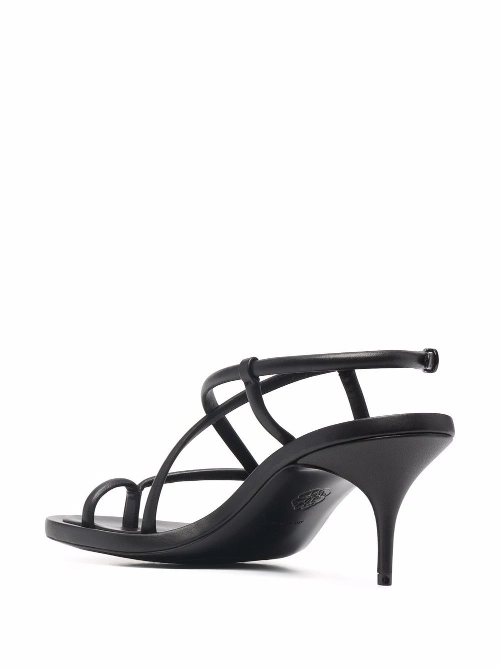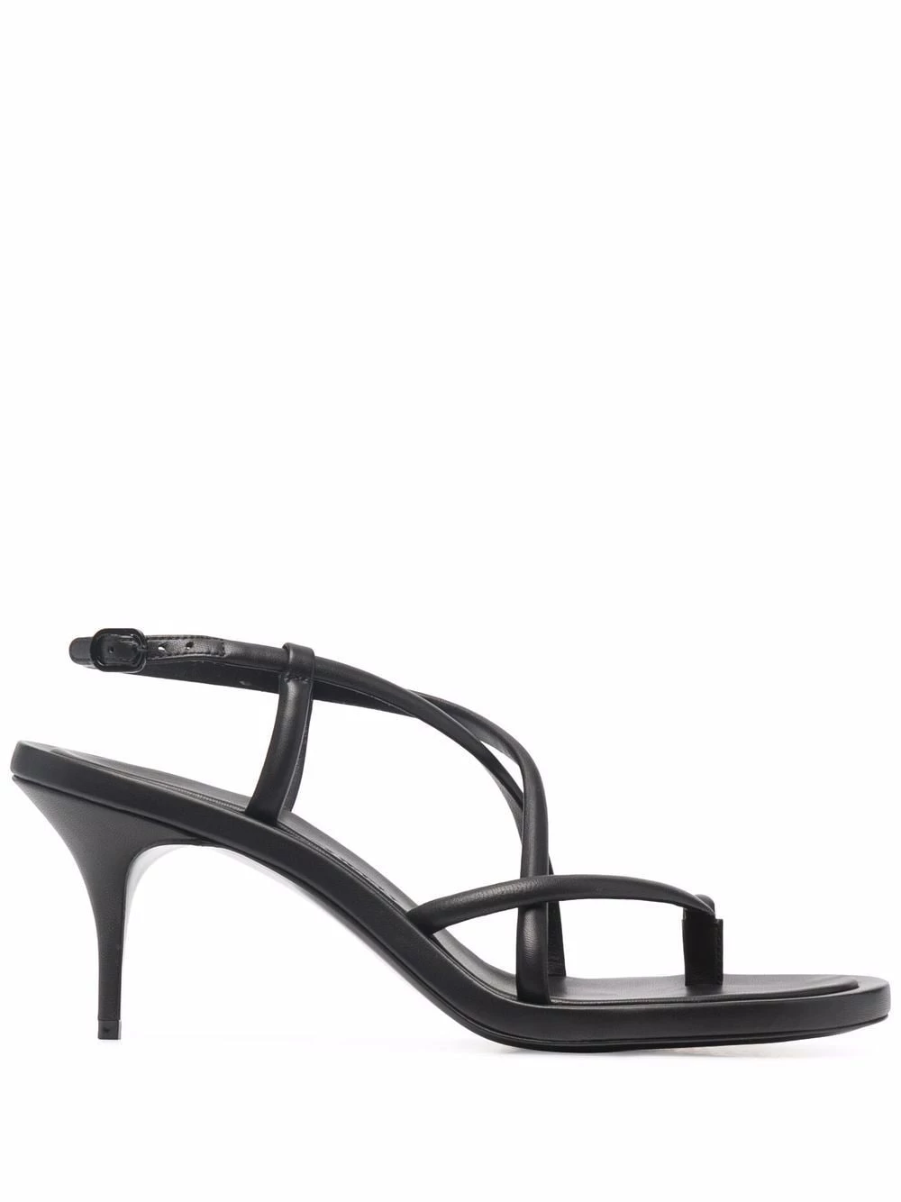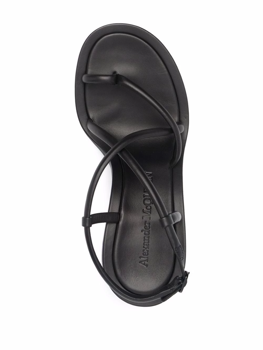 Alexander McQueen presents a stripped-back AW21 collection, opting for a muted colour palette and furthering the focus on craftsmanship. These simple black strappy sandals are crafted from nappa bombe leather and feature a toe loop strap.ย