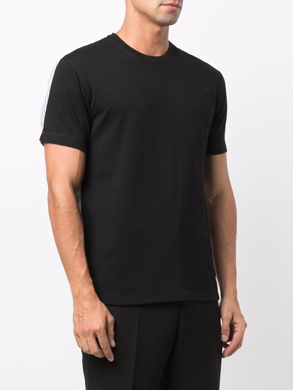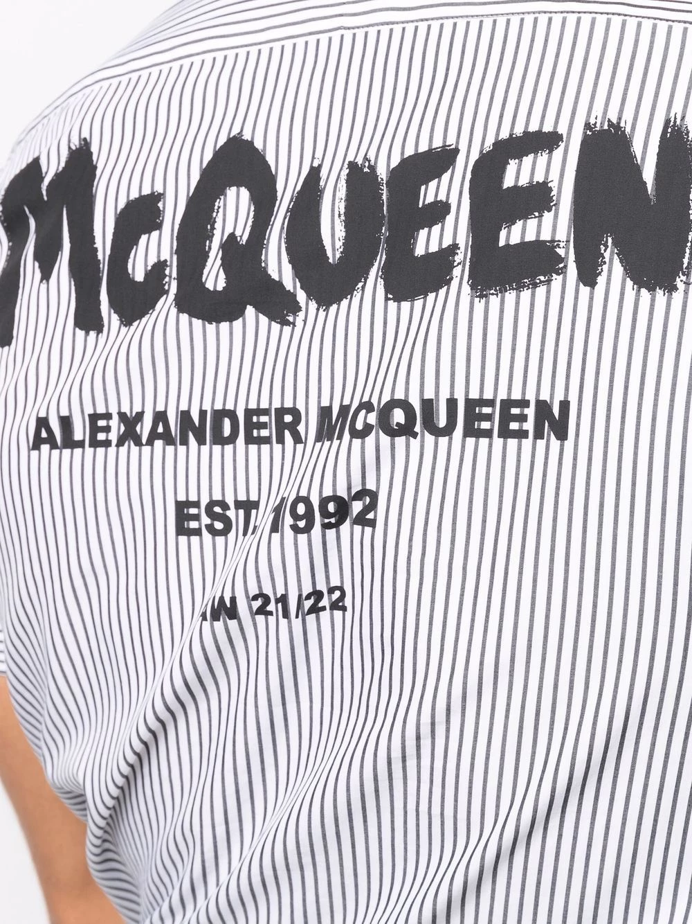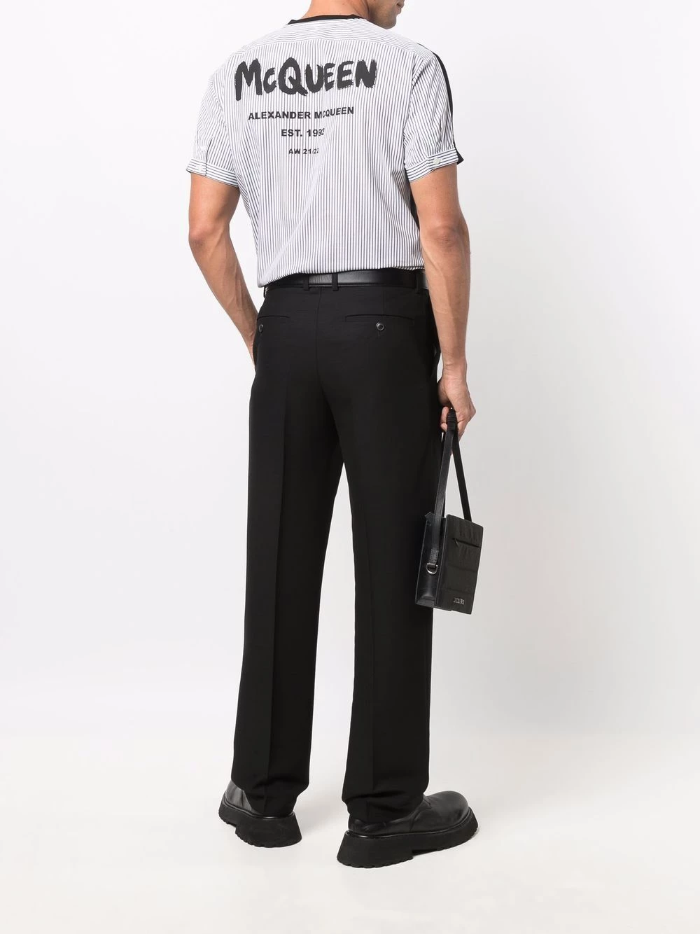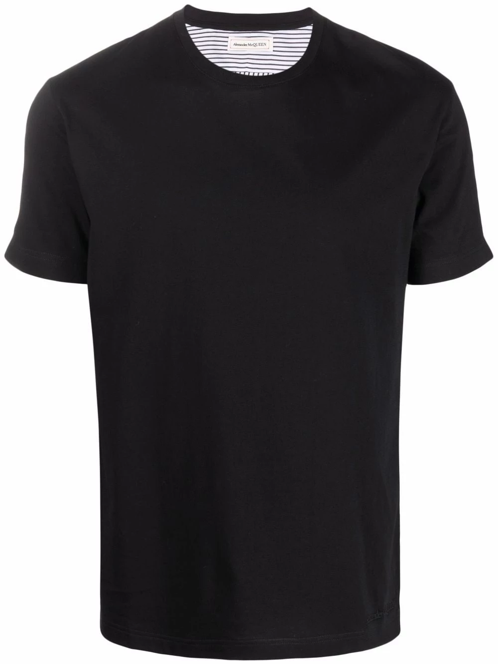 Alexander McQueen’s T-shirt looks like a classic black cotton T-shirt from the front but the rear showcases a striped print and logo lettering for a contrasting look.