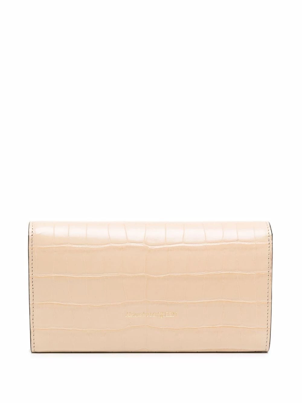 Alexander McQueen’s crocodile-embossed effect wallet is distinguished by its long wide shape and its polished gold-tone metal skull decorating the front. This beige leather accessory has plenty of compartments with card slots and a zip pocket found inside.