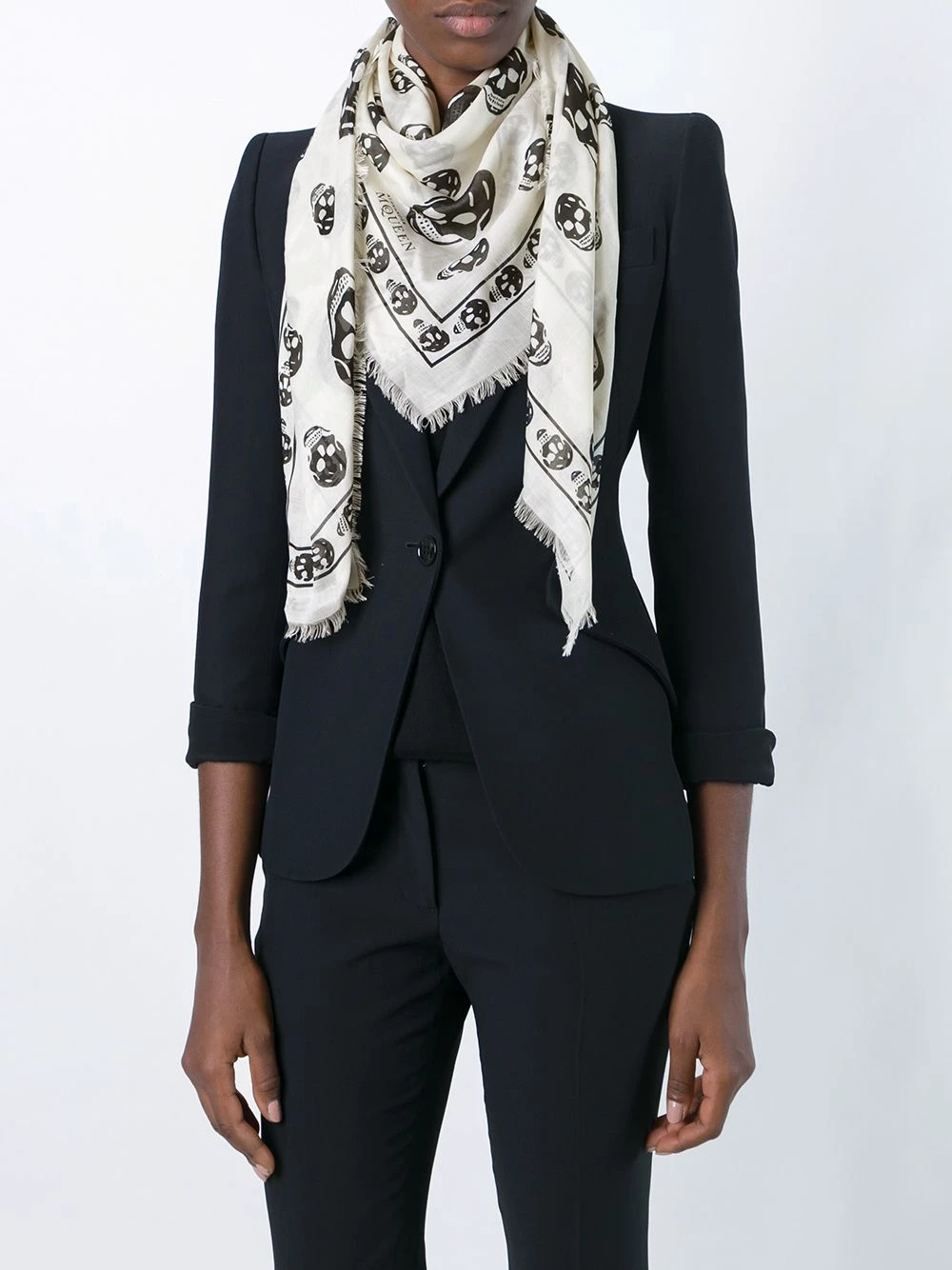 Ivory and black fringed skull-print scarf from Alexander McQueen featuring frayed edges.