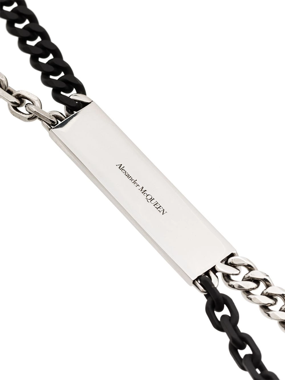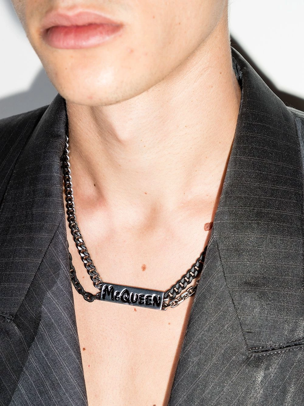 Nodding to streetwear, Alexander McQueen’s graphic Graffiti motif appears reiterated on this double silver-tone and black brass chain as a boldly branded plaque.ย