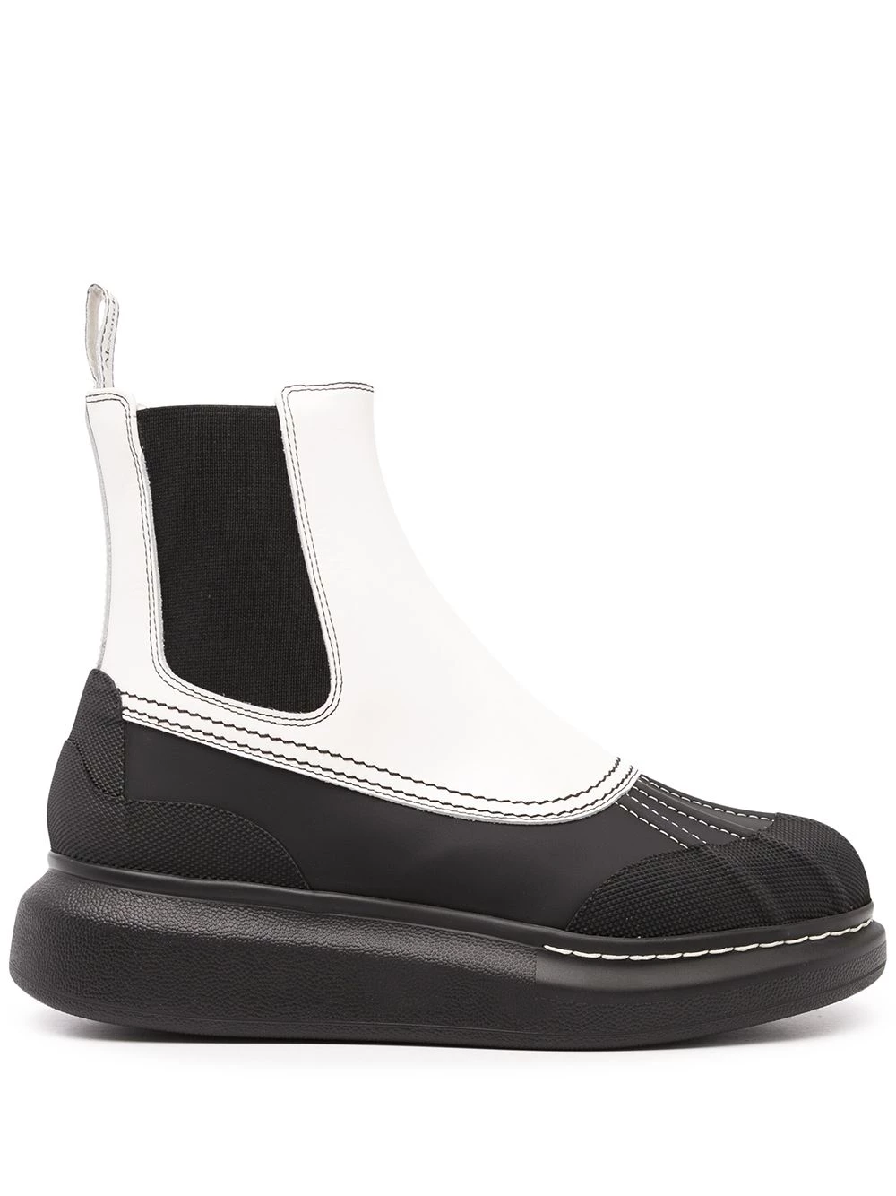 Part of Alexander McQueen’s AW21 edit, these Duck Hybrid blend a utilitarian style with the classic Chelsea silhouette. In a two-tone design, this pair features the typical elasticated side panels and is set atop a chunky rubber sole.