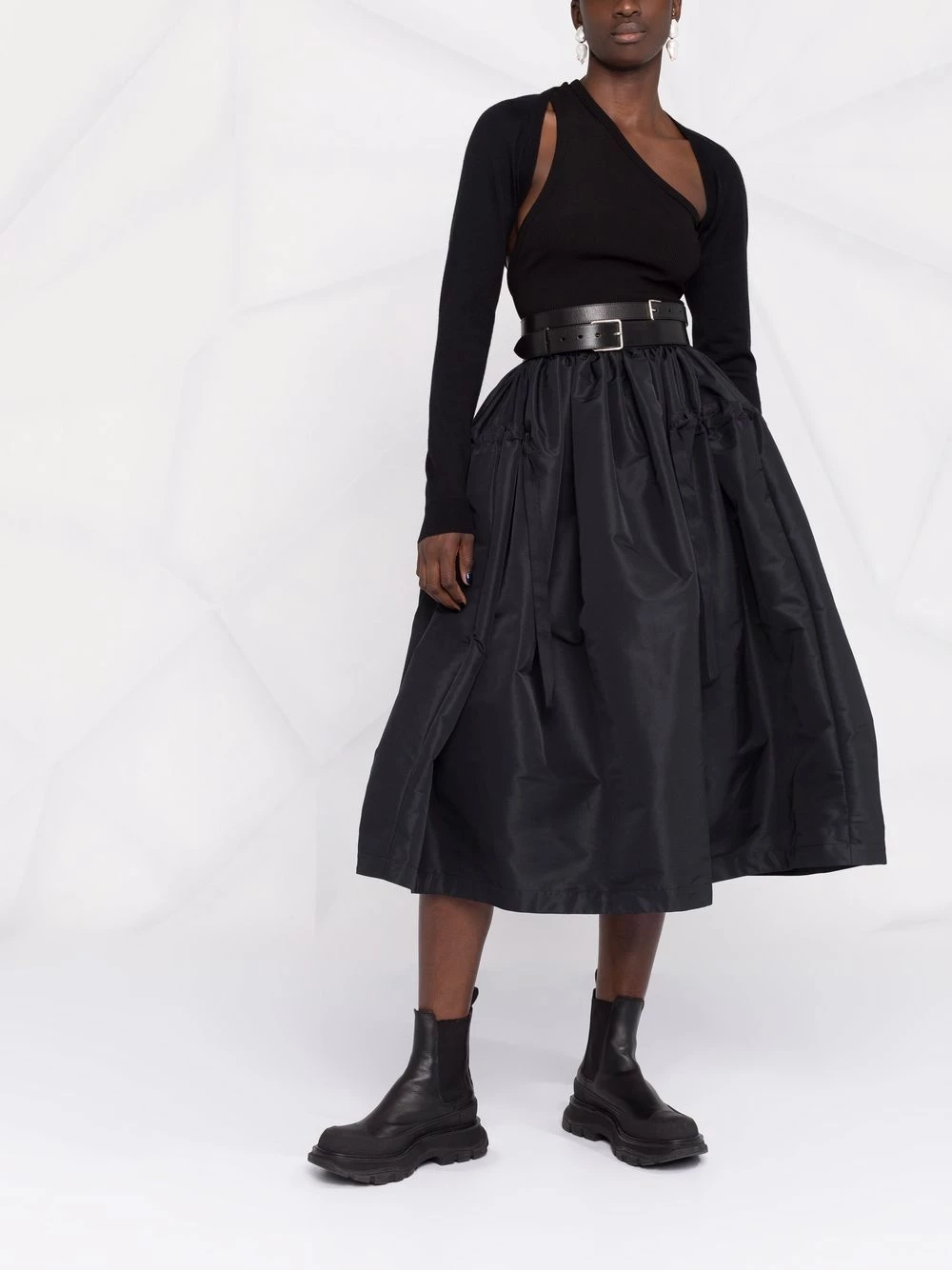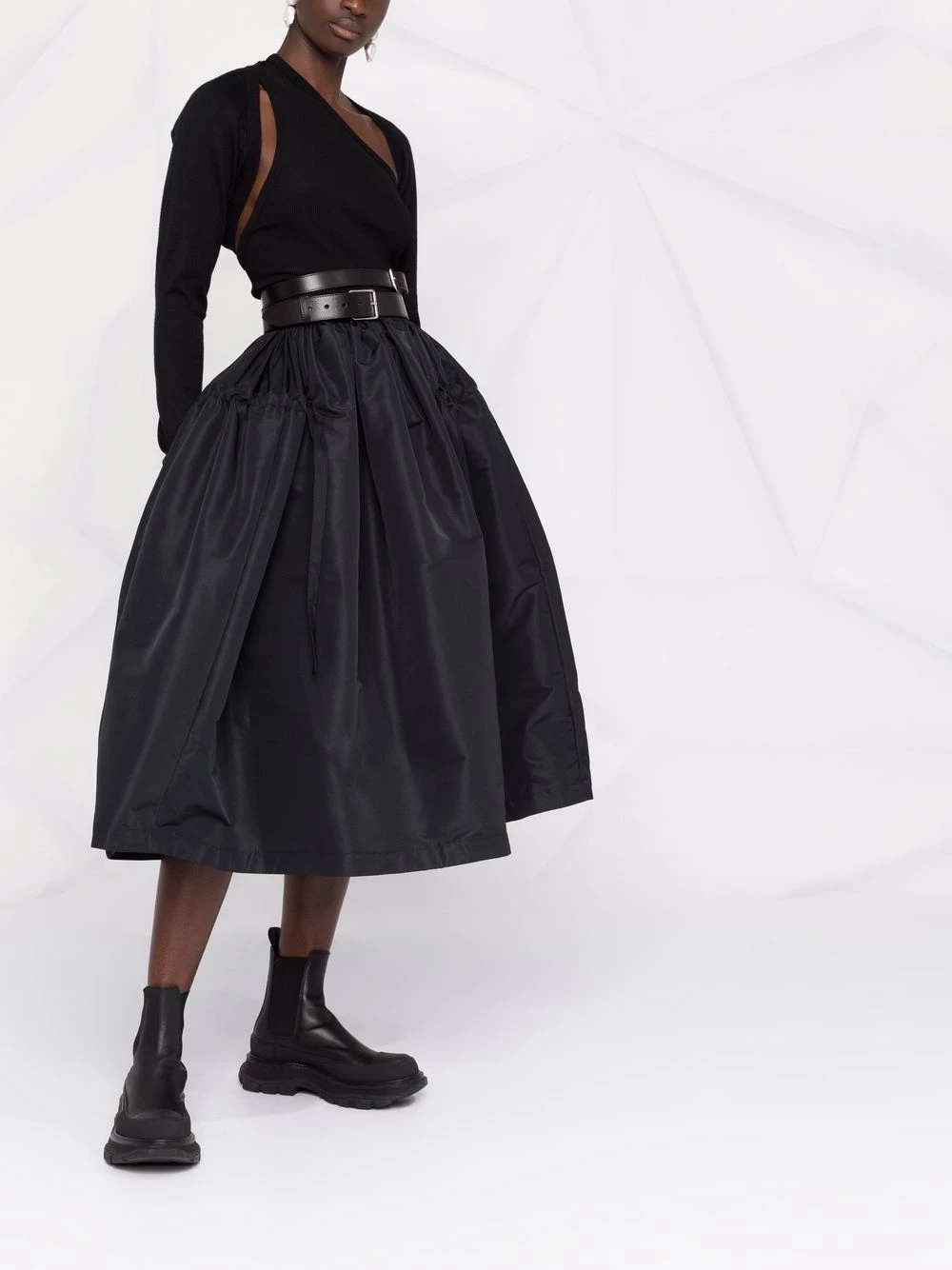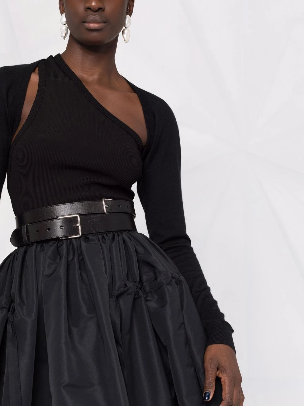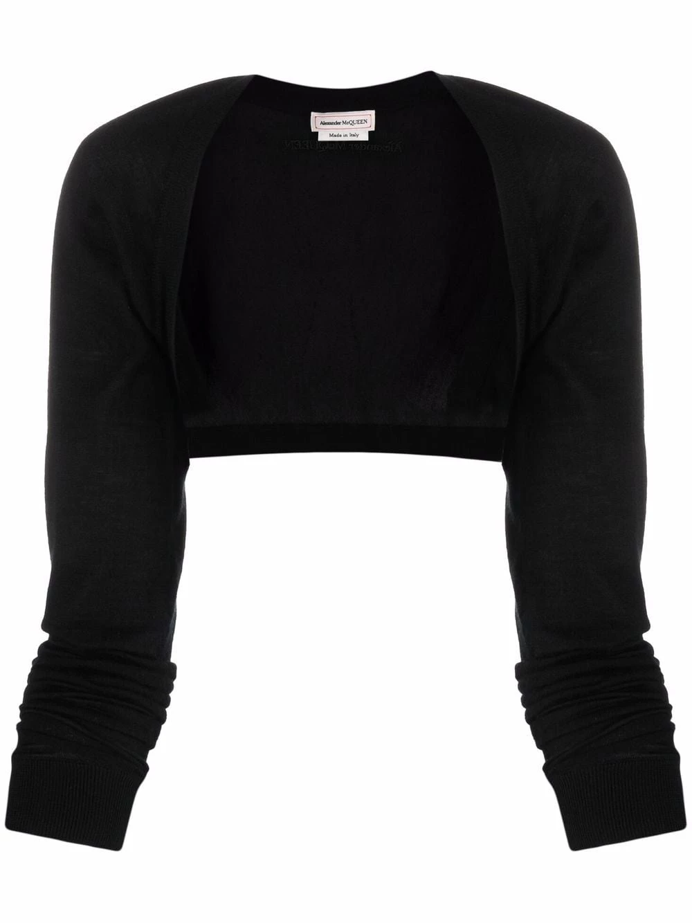 Crafted from cashmere in a fine knit, this black shrug from Alexander McQueen is a versatile layering option. Note the embroidered logo to the rear for a signature touch..