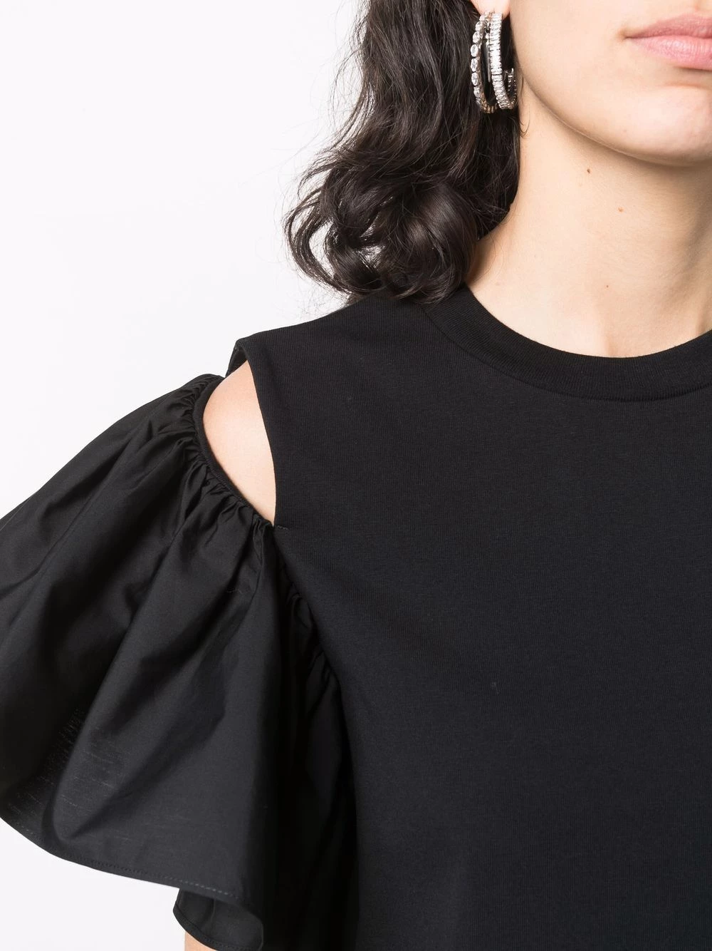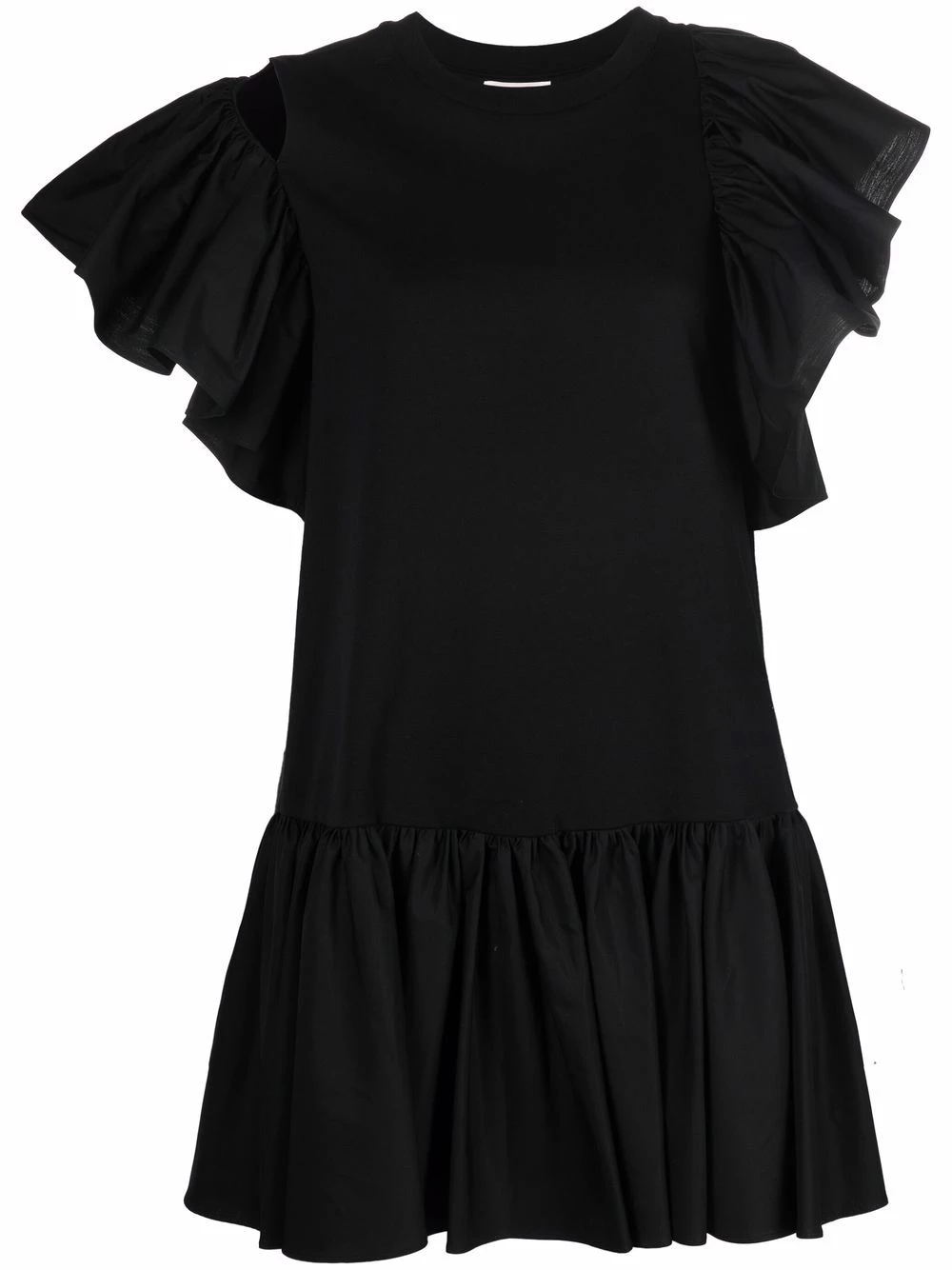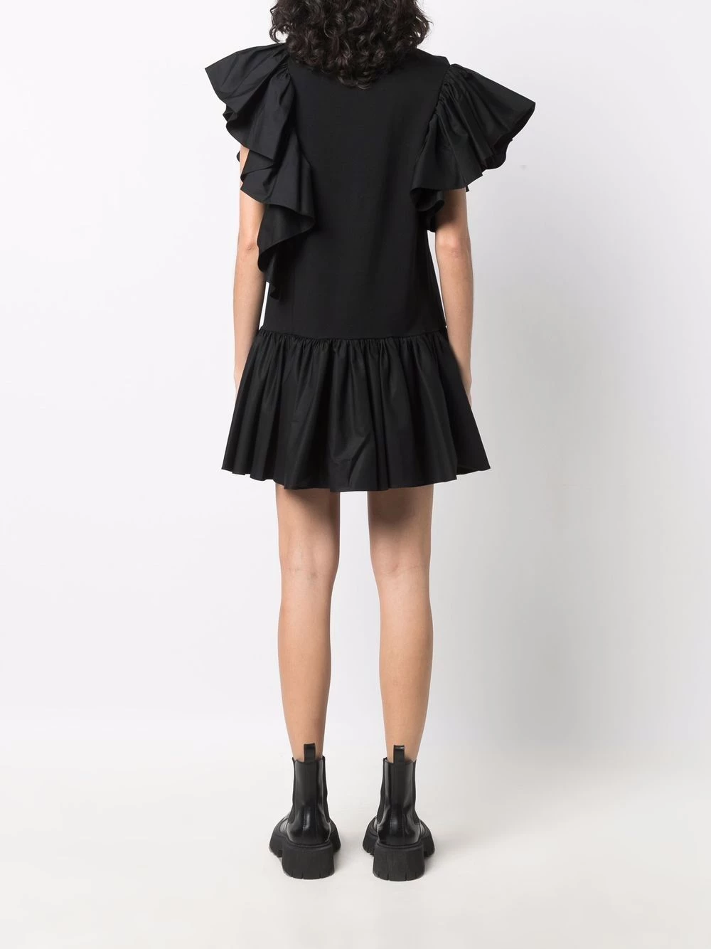 Alexander McQueen’s dramatic style is showcased with this voluminous cotton dress. Defined by ruffle-trimmed sleeves, the tonal design showcases a dropped waist and pleated skirt for added detail.ย