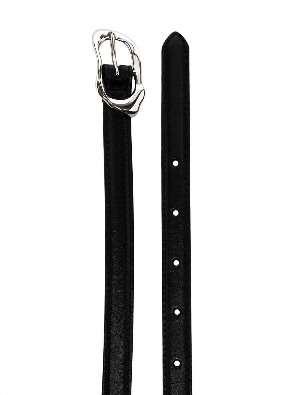 Alexander McQueen’s slim silver buckle belt is a contemporary treat with a uniquely shaped buckle that stands out from the black leather strap thanks to its polished silver-tone metal construction.