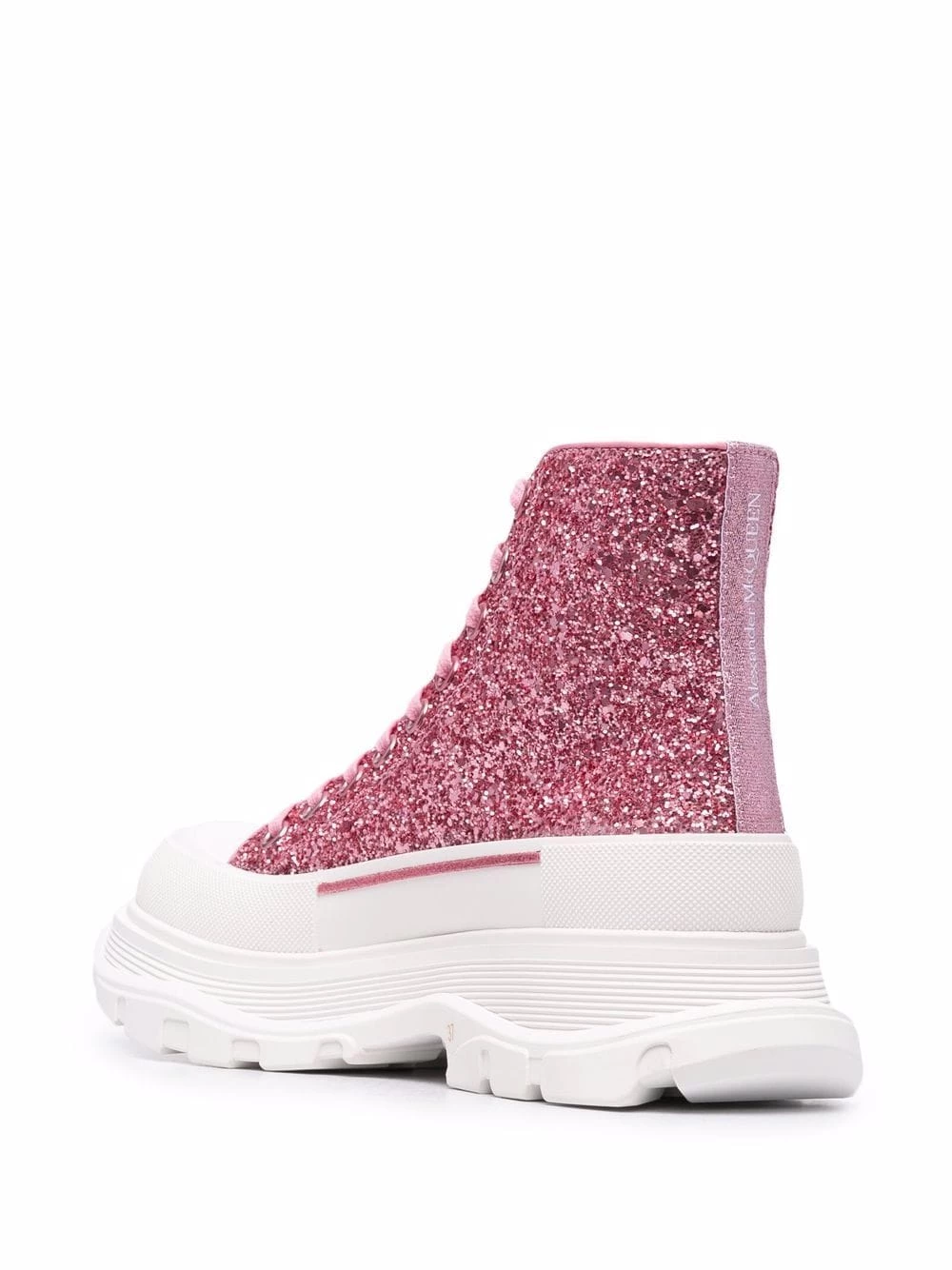 Since its debut in 2019, Alexander McQueen’s Tread Slick style has been updated in various guises. These pink glittered ankle boots offset the chunky rubber sole that’s characteristic of the design.