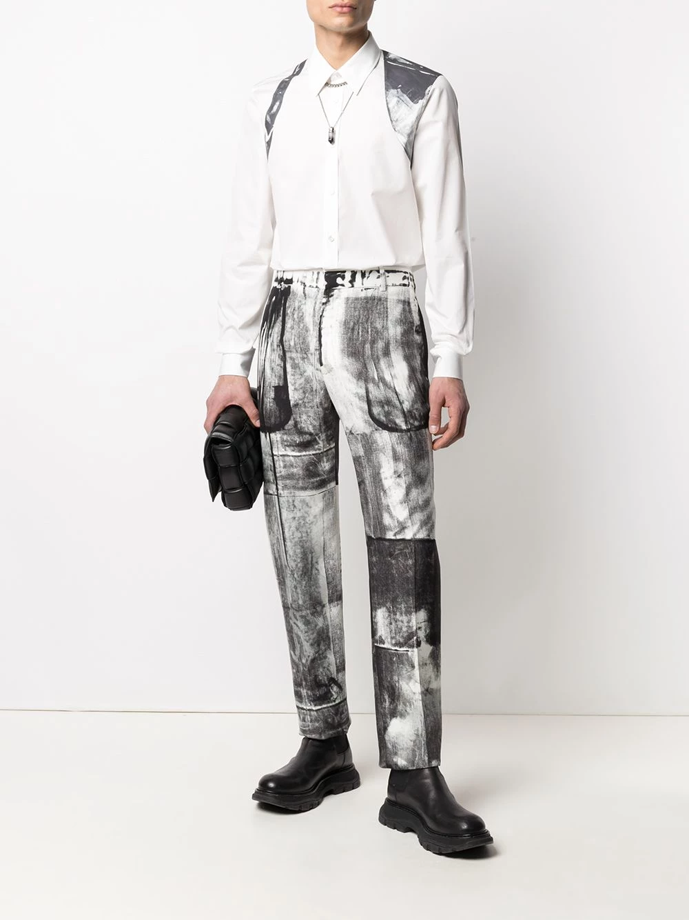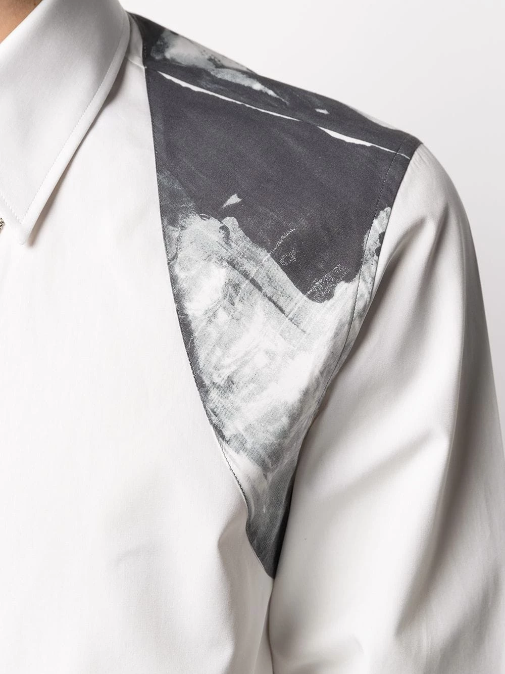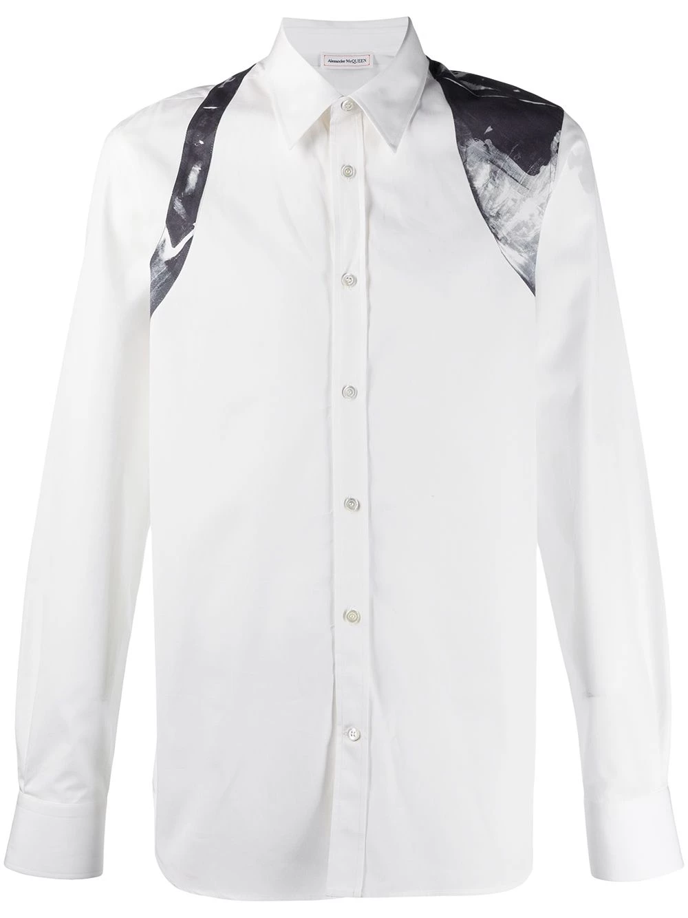 Tired of the same white shirt for work? Add a touch of McQueen to proceedings with this abstract print harness detail crisp cotton shirt. Say goodbye to tailoring fatigue.