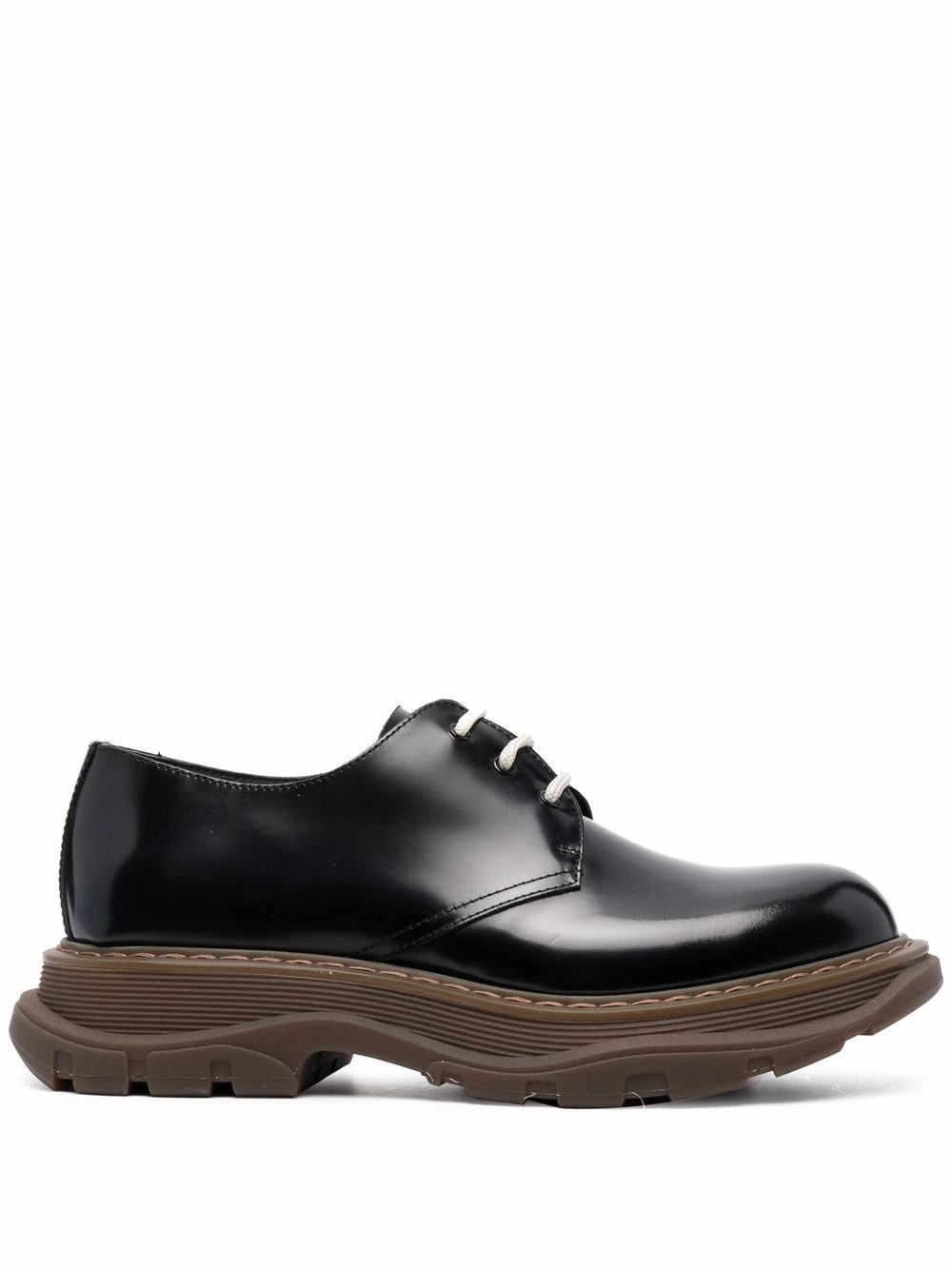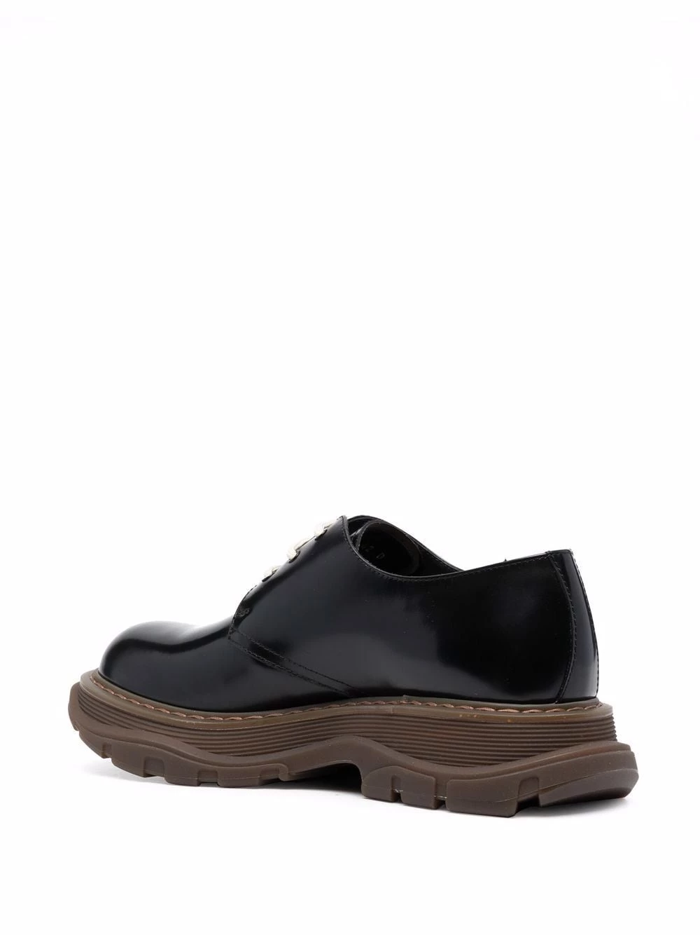 Black leather rubber sole derby shoes from Alexander McQueen featuring round toe, front lace-up fastening, contrast stitching, ridged rubber sole and glossed finish.