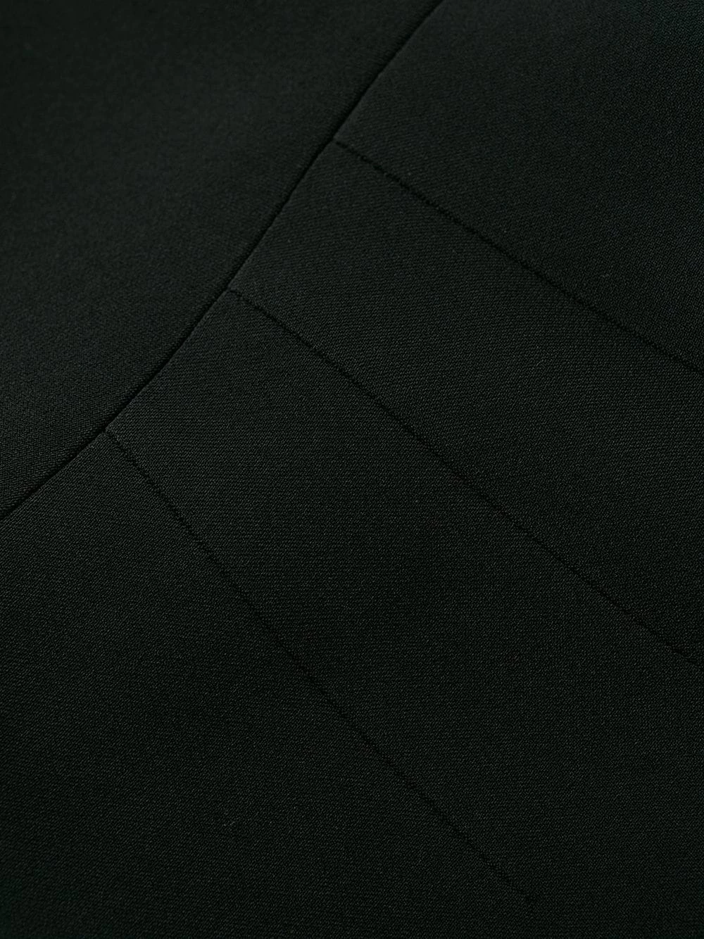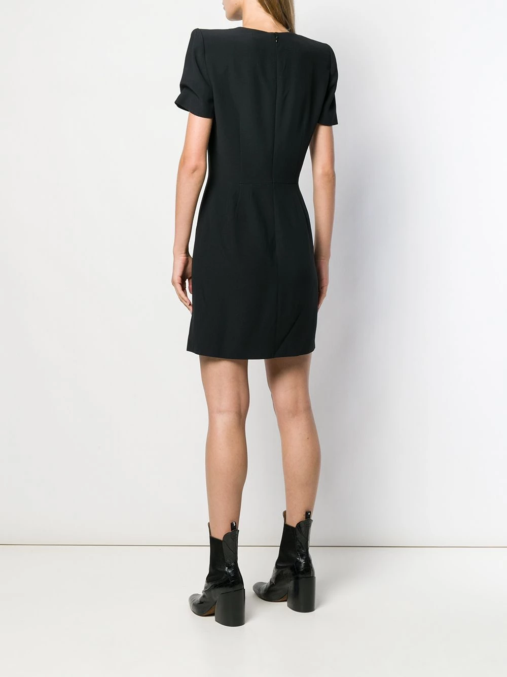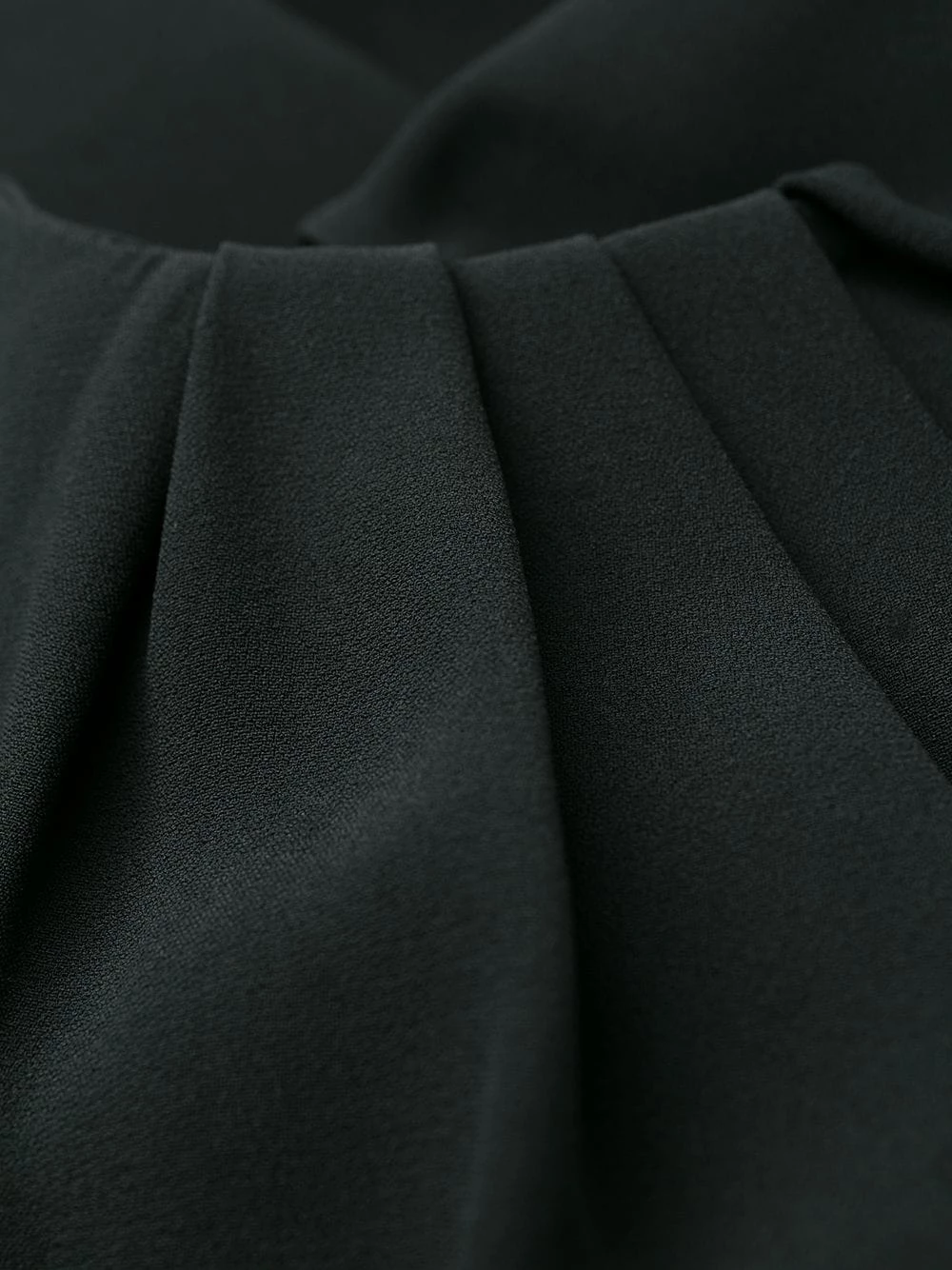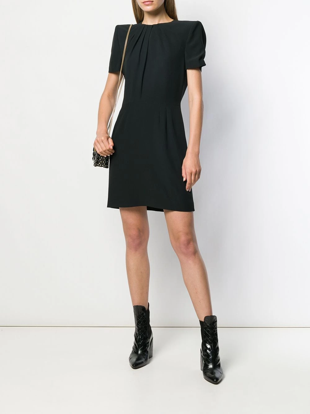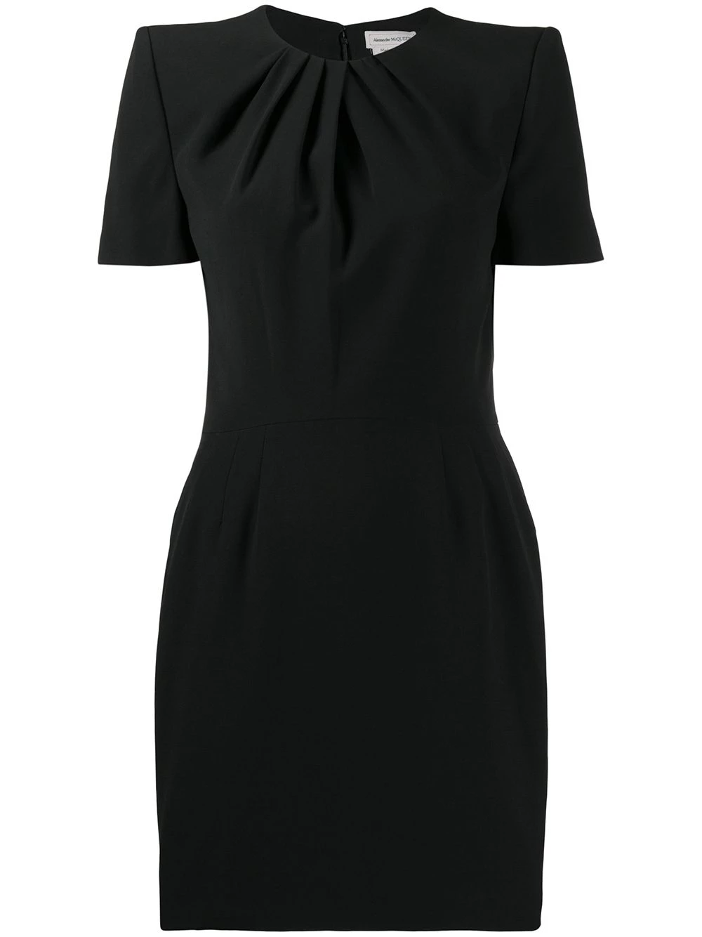Alexander McQueen replaces gothic, dark romanticism for classic feminine designs in the newest collection. This black dress has a round neck, short sleeves, a cinched waist and a ruched design at the chest.