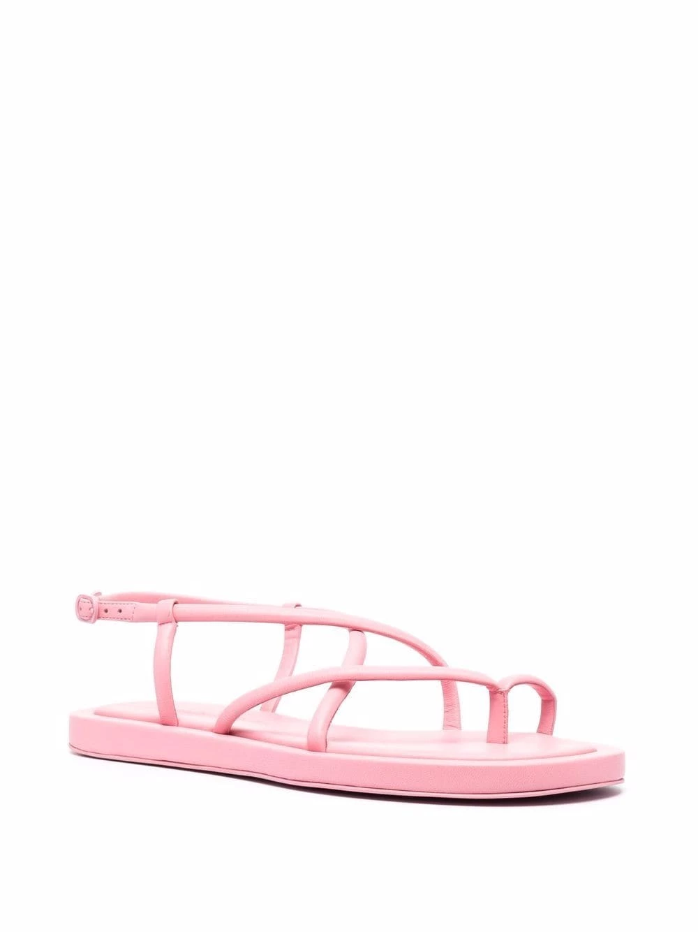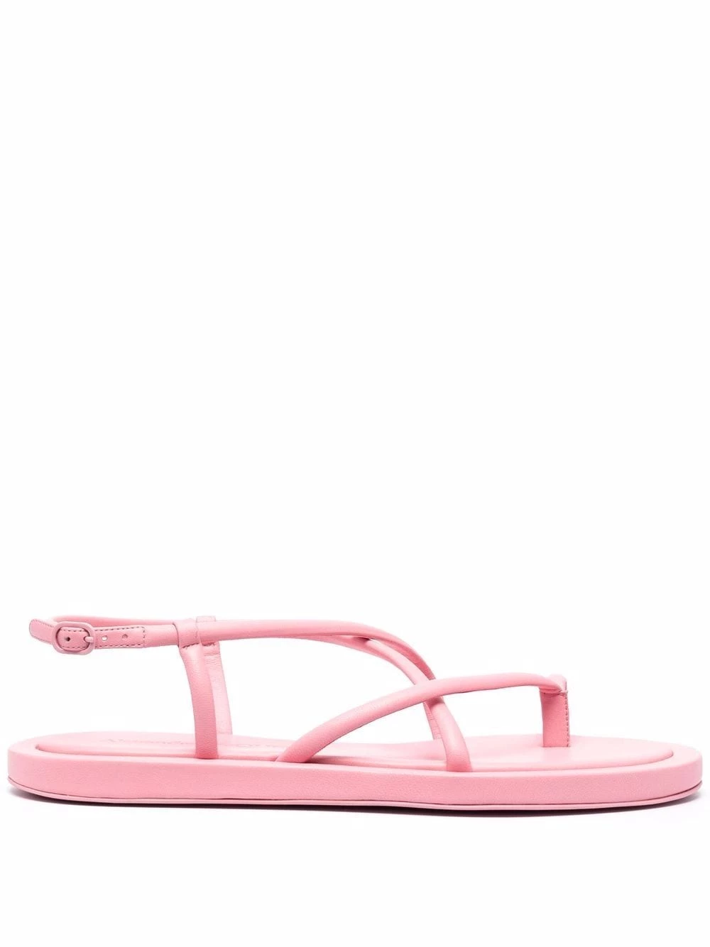 Alexander McQueen presents a stripped-back AW21 collection, opting for multiple iterations of strappy sandals. This pastel pink version sits on a flat sole and features a toe loop strap.