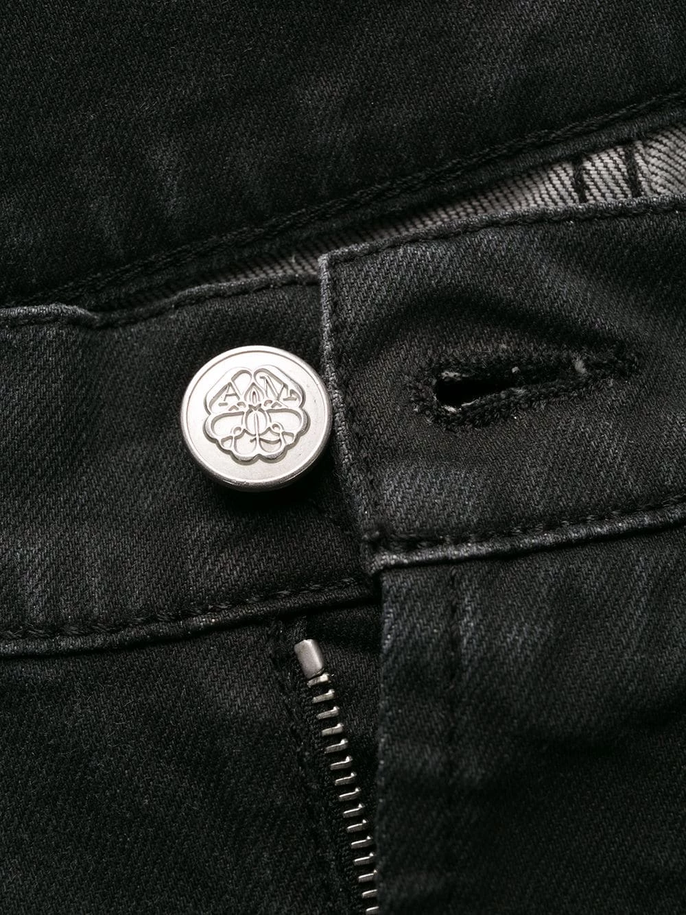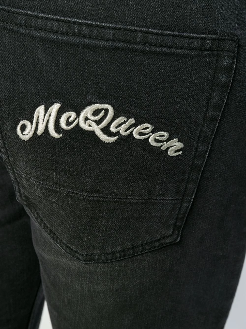 Restlessly inserting light punk rock references to traditional pieces, Alexander McQueen is the place of birth of attitude and statements, as seen in these washed black embroidered signature slim-fit jeans. Featuring a regular length, a mid rise, a waistband with belt loops, a button and zip fly, two front pockets, two back patch pockets, silver-tone hardware and an embroidered logo to the rear.