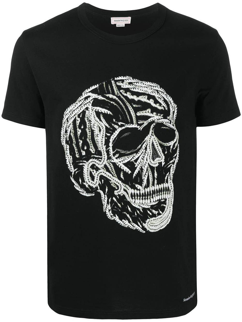 Turn heads wearing this skull print T-shirt. Signature to Alexander McQueen, the embroidered design adds a tangible twist to the classic T-shirt. Get comfortable in creativity.