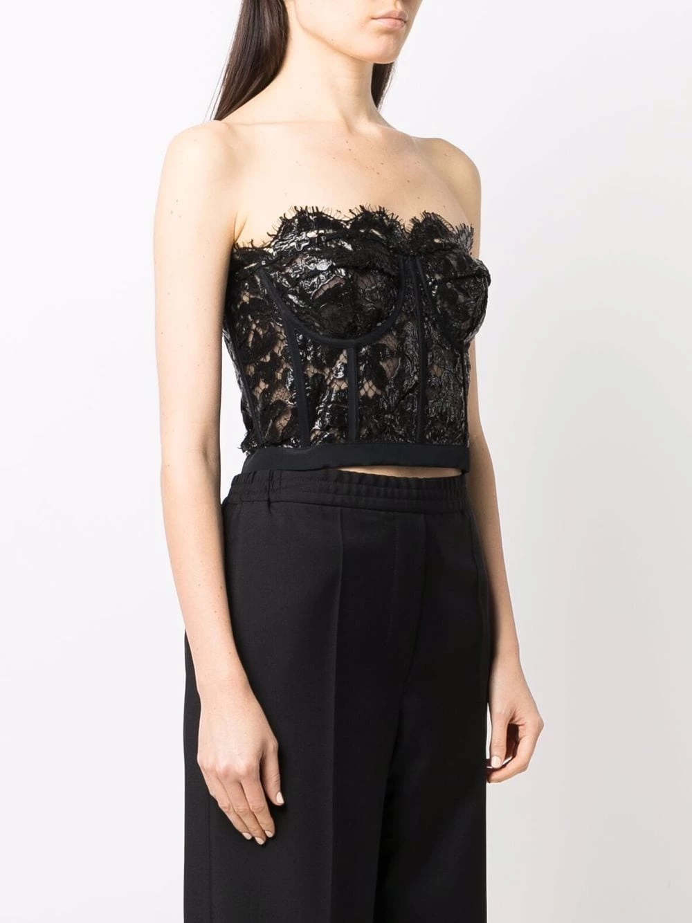 Known for a design style that balances romantic with gothic, it is reflected in this Alexander McQueen strapless top featuring lace panelling and a boned bodice. Refined in its tonal colourway, it also highlights the technical construction of the garment.