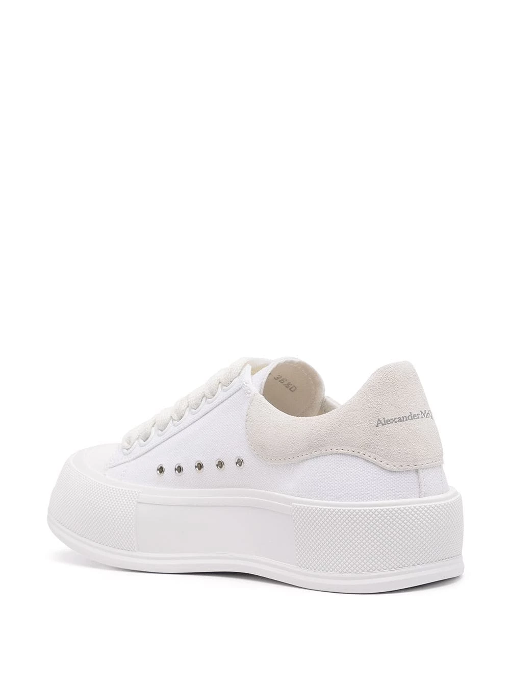 Known for creating distinctive silhouettes through technical construction, this approach is applied to these Alexander Mcqueen sneakers. The front lace-up fastening, silver-tone hardware eyelets and rubber sole become exaggerated details which in a white palette remain refined.ย