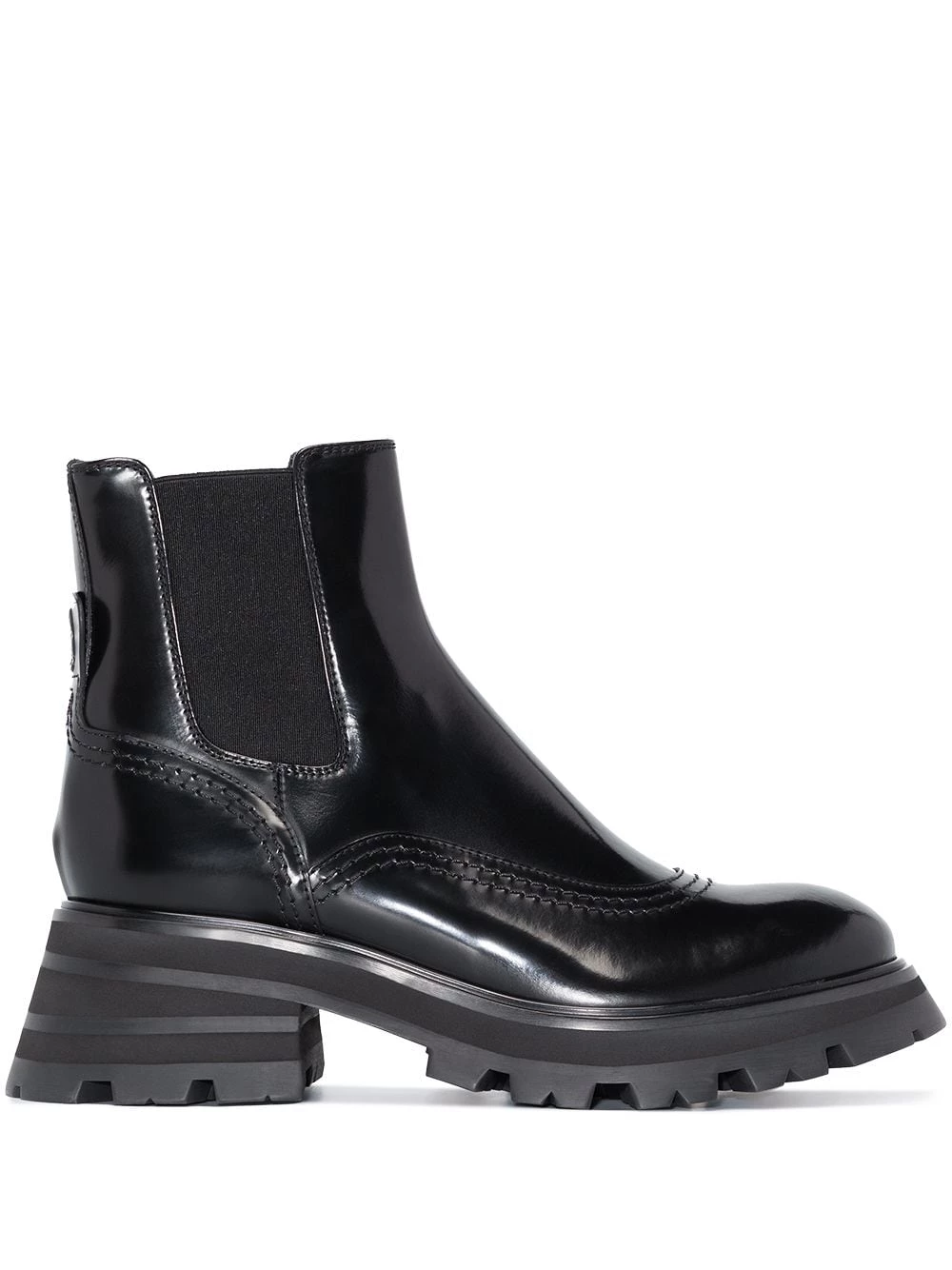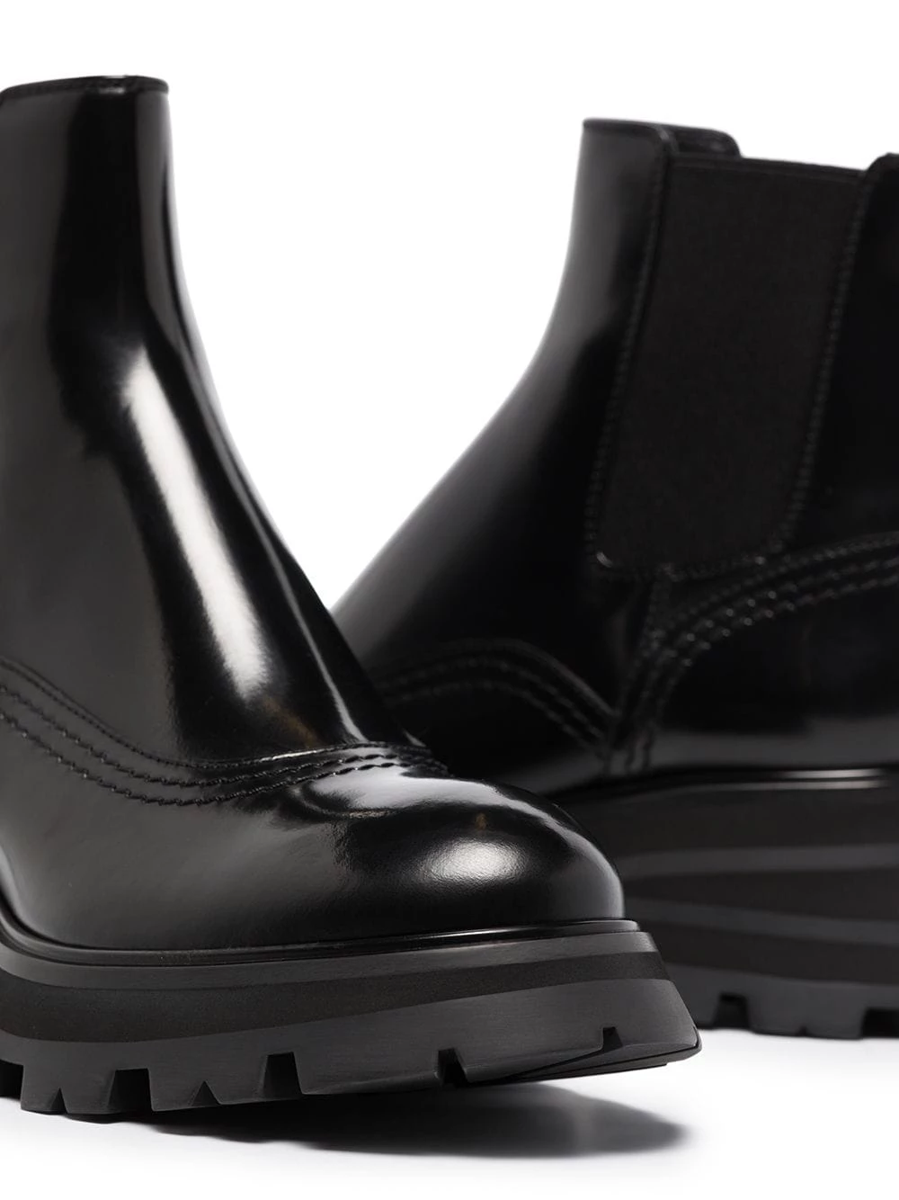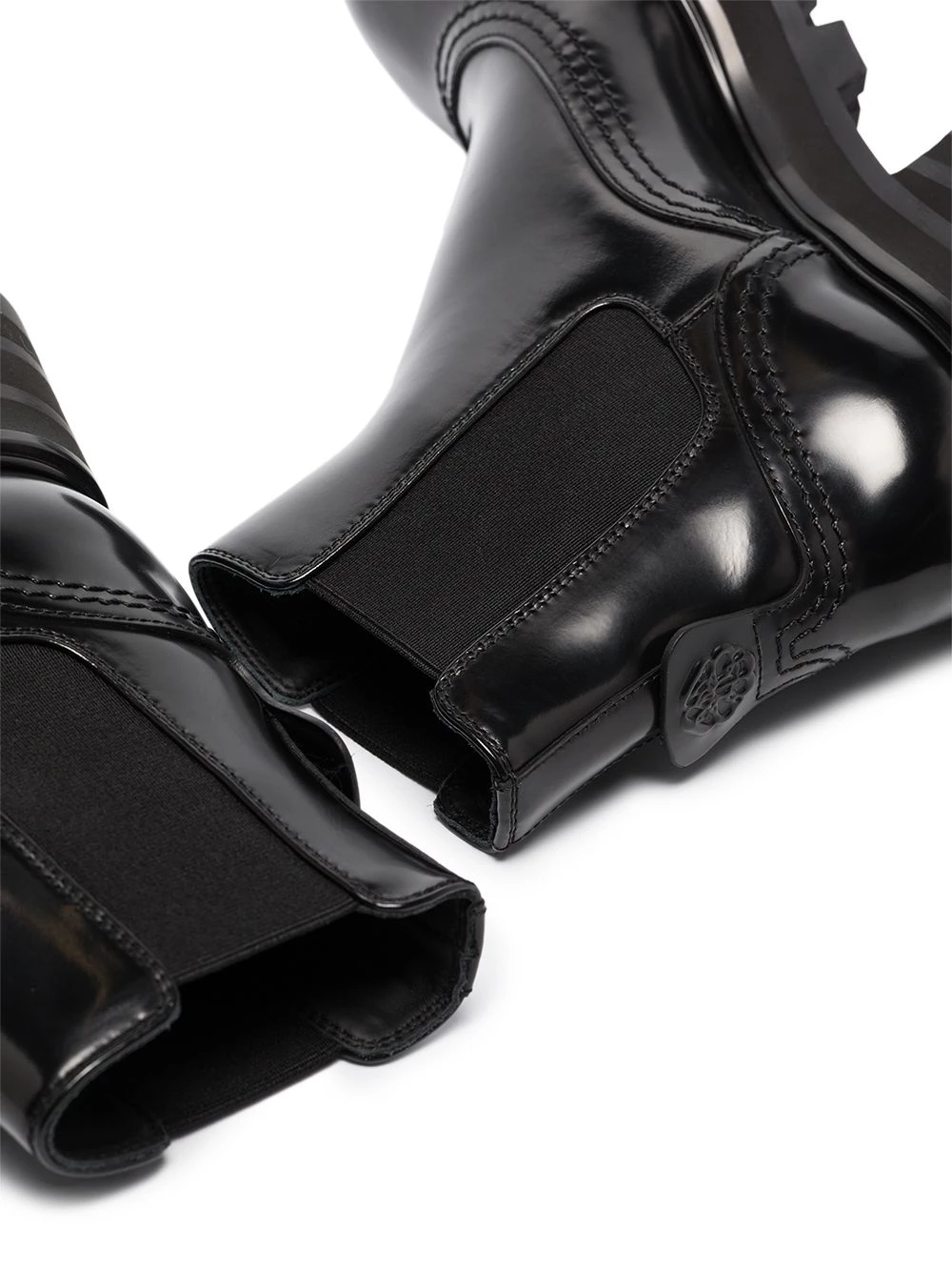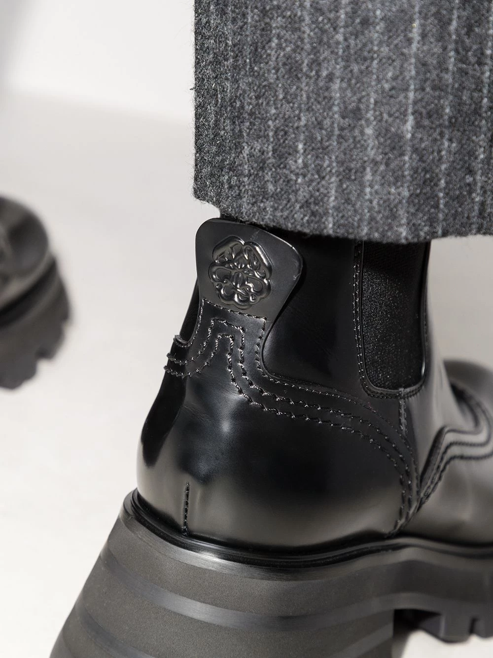 Evoking its signature oversized silhouette, Alexander McQueen has designed the Wander Chelsea boots with a chunky rubber that seamlessly contrasts with their refined soft leather construction. Made practical thanks to elasticated side panels and a pull-tab at the heel, they perfectly encapsulate the understated yet theatrical aesthetic of the brand.