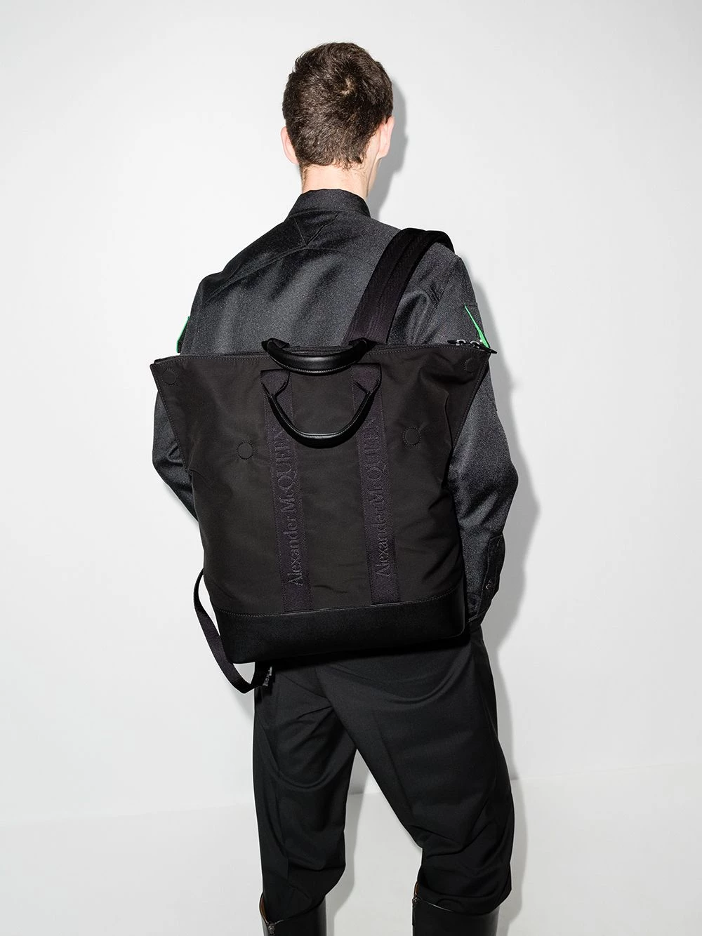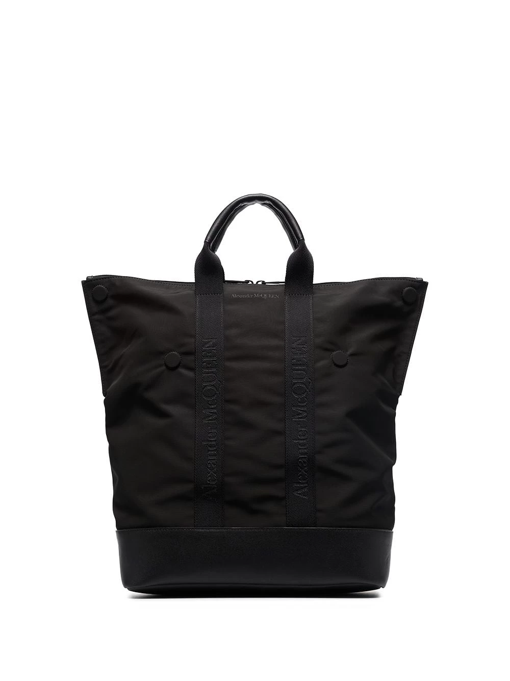 This iteration of Alexander McQueen’s De Manta backpack is cast in a sleek all-black palette and retains the signature top handles that allow it to be carried as a shopper bag.