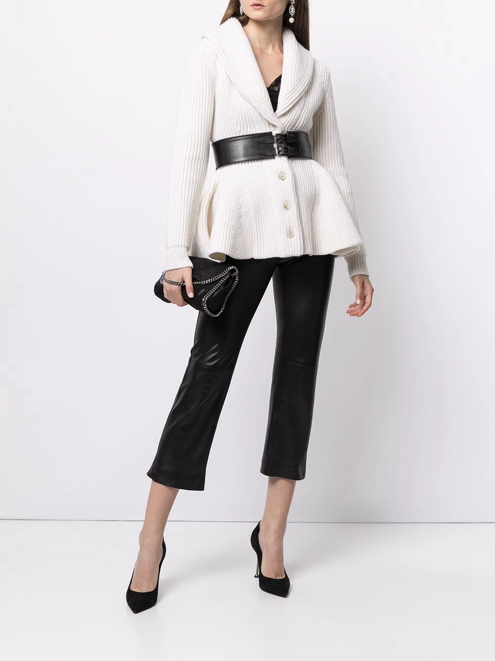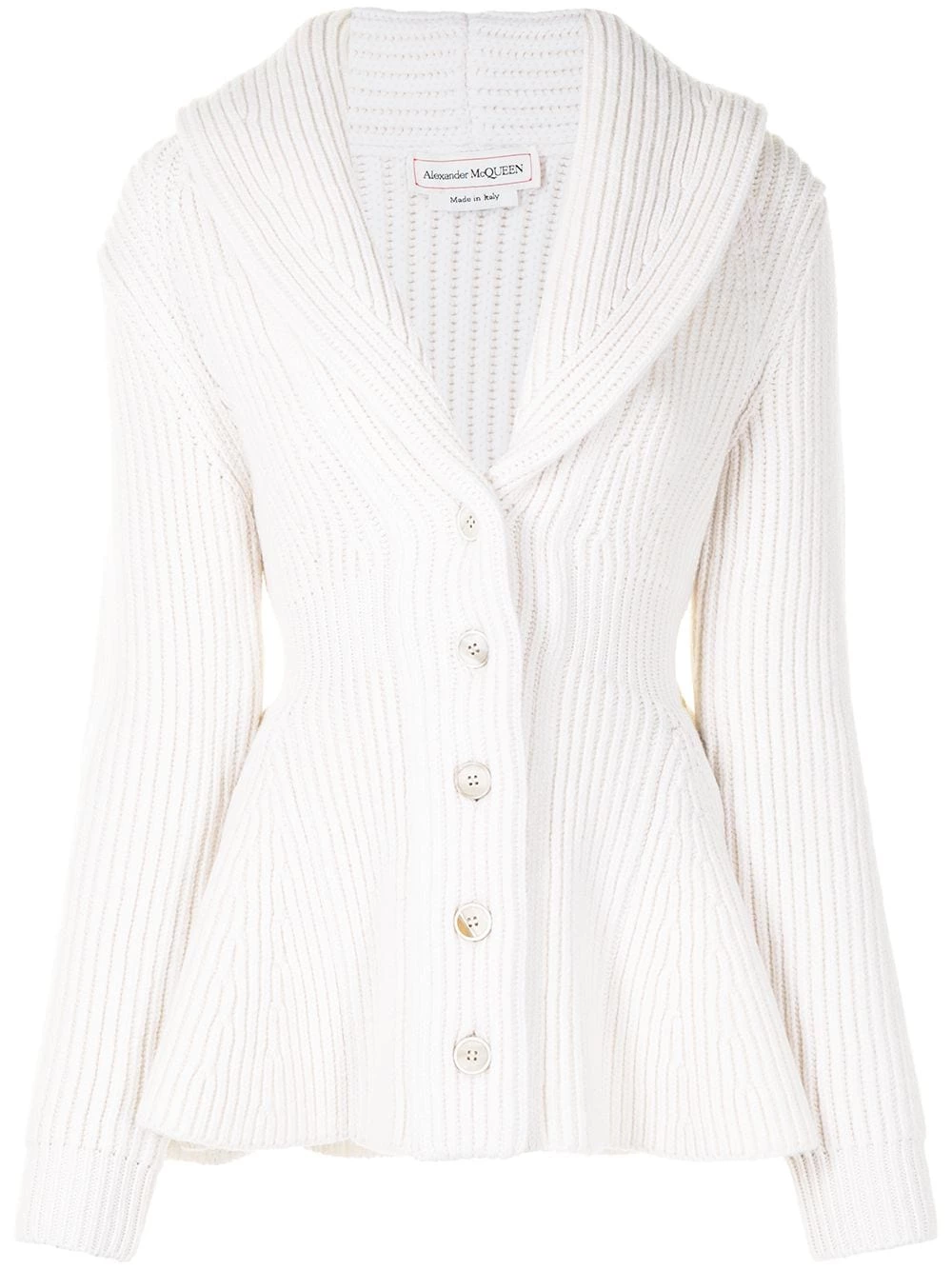 Knitwear but make it Alexander McQueen. Featuring a peplum waist, and flared sleeves this Exploded rib-knit cardigan will add a Victorian edge to your outfit. Historic.