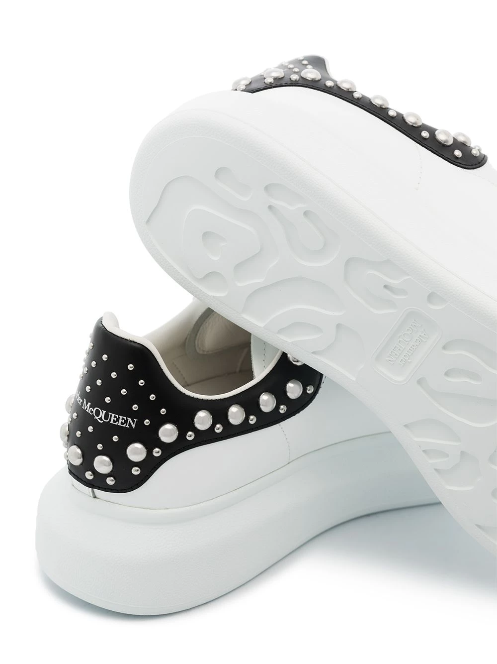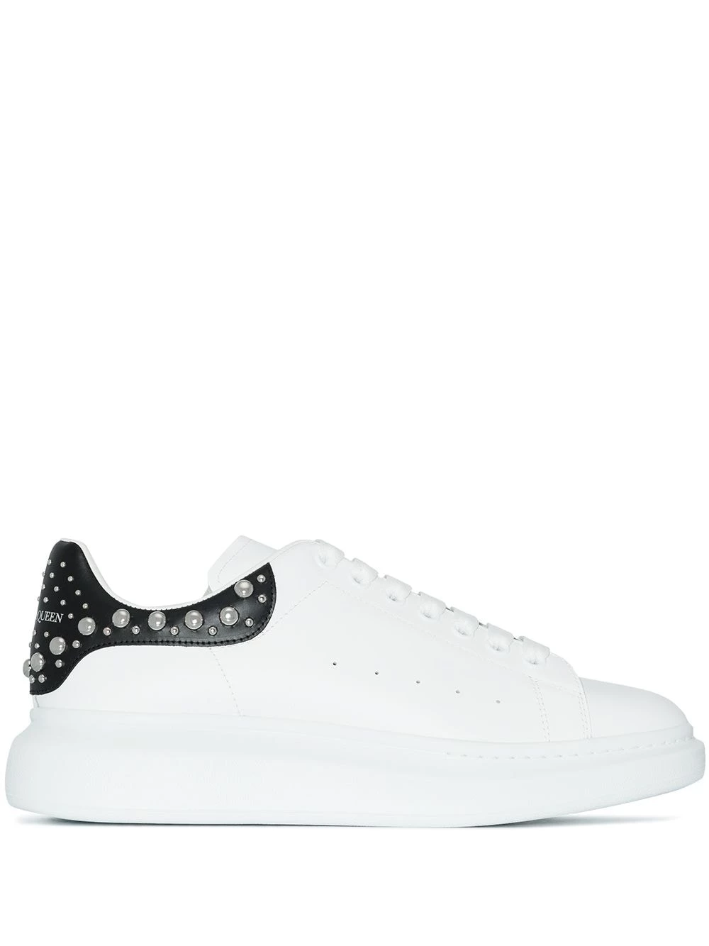 Launched in 2015, the Oversized sneakers are an iconic Alexander McQueen style. For AW21, the signature sneakers are presented with a pearl and sequin-embellished branded heel counter. In a white hue, these low-top trainers sit atop the characteristic oversized rubber sole.