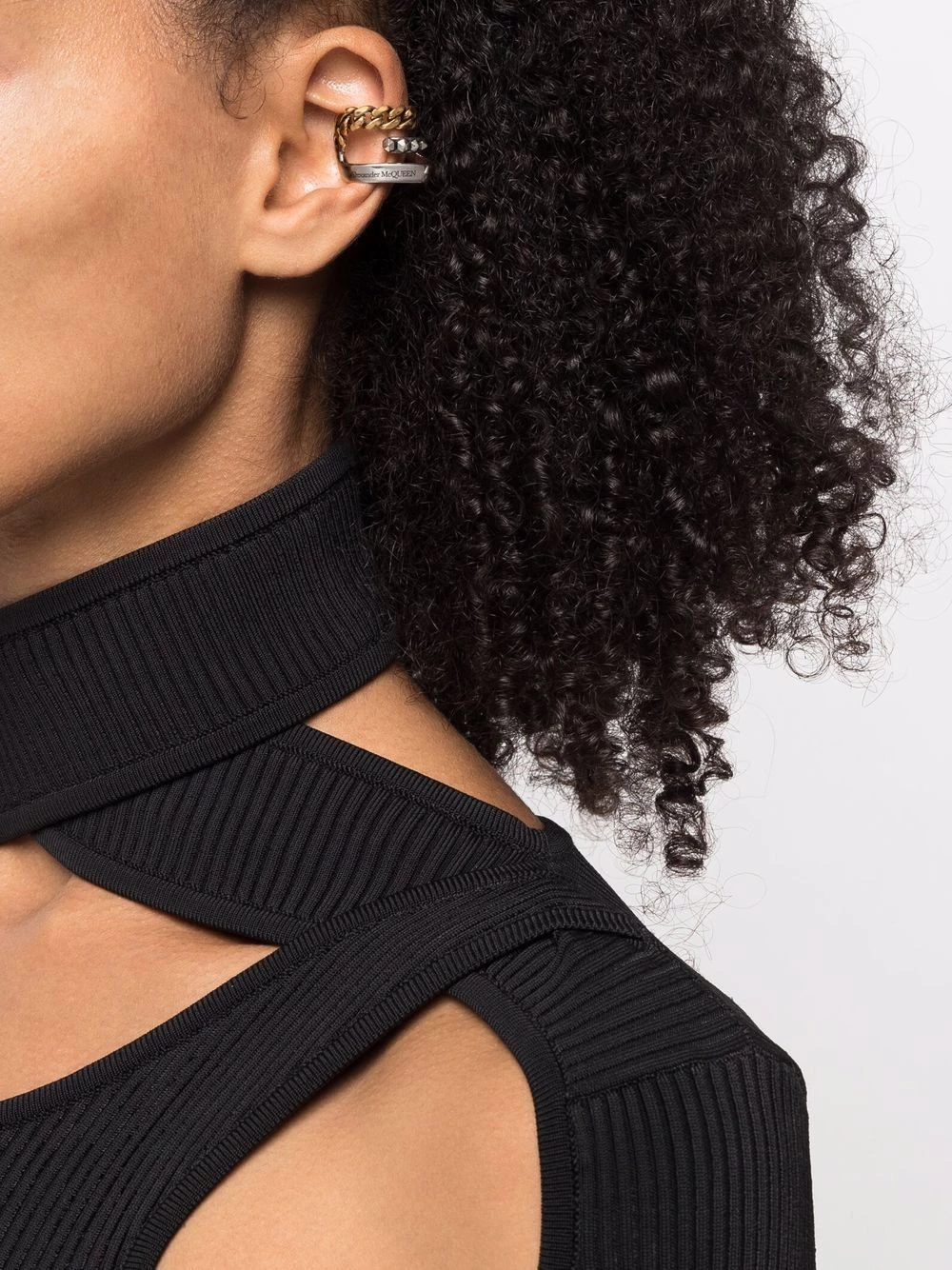 Finished with an antique effect, this ear cuff celebrates Alexander McQueen’s punk aesthetic. Suitable for non-pierced-ears, this piece is detailed with small studs and an engraved logo.