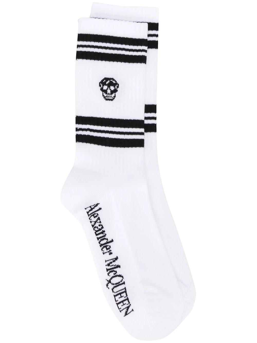 We all have some skeletons in the closet. Yours if the fact that you still haven’t stocked up on these white stretch cotton ribbed skull print ankle socks from Alexander McQueen. You should probably do something about it. Featuring a stretch fit, horizontal stripes, an ankle length and a logo to the outside. Socks and Hosiery must be returned in its original unopened packaging.