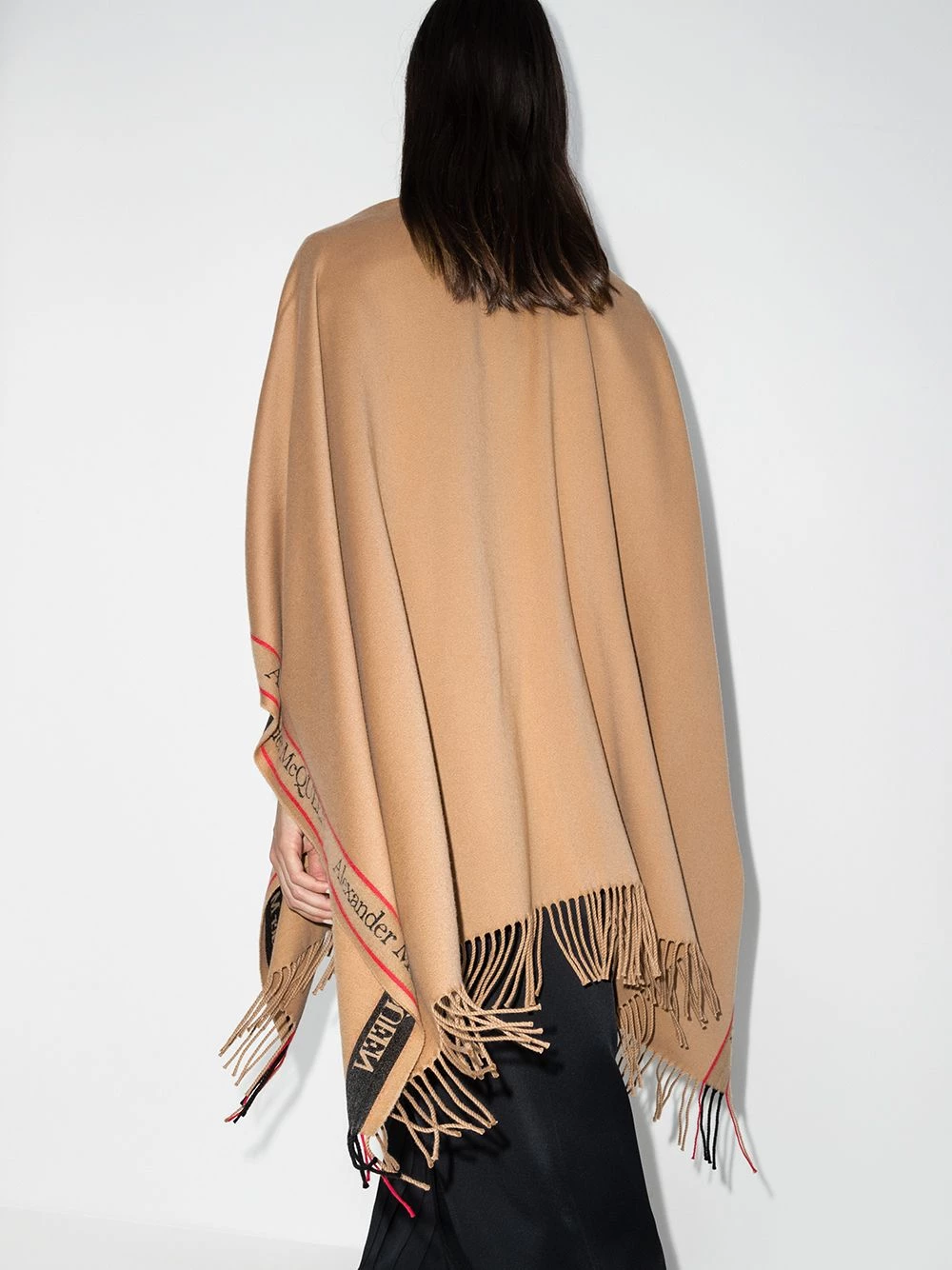 Beat the chill in style with Alexander McQueen’s cape. Spun camel cashmere and wool-blend that feels so soft to the touch, it’s trimmed with wispy fringing punctuated with the brand’s Iconic stripe. Roll on winter.