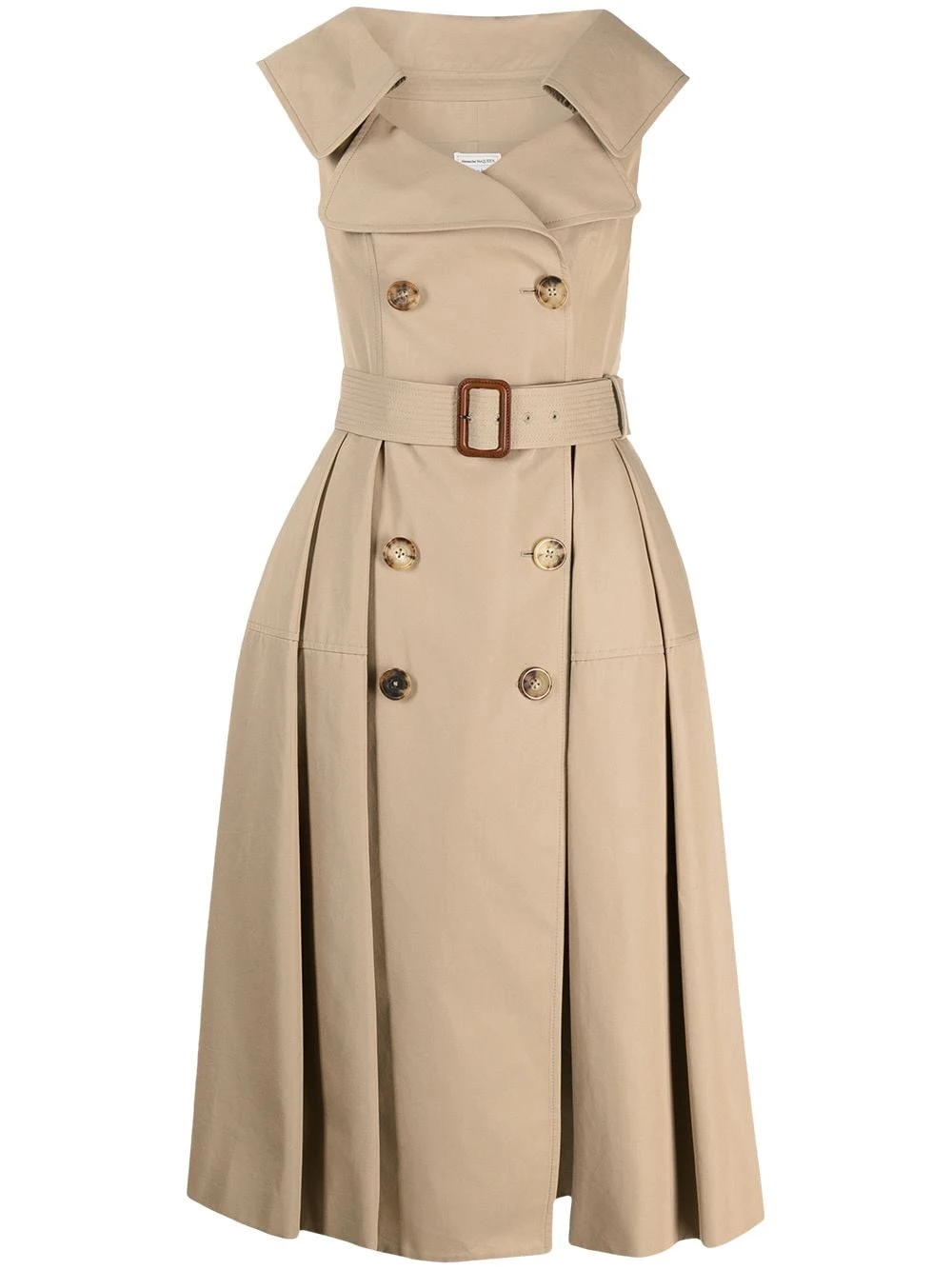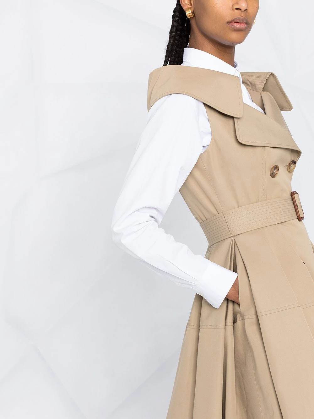 This trench is different from the others. Alexander McQueen’s sleeveless trench coat is shaped with a pleated lower for just the right amount of volume. There’s nothing boring about beige.