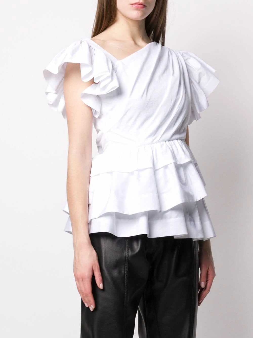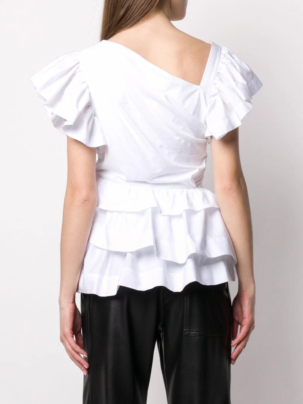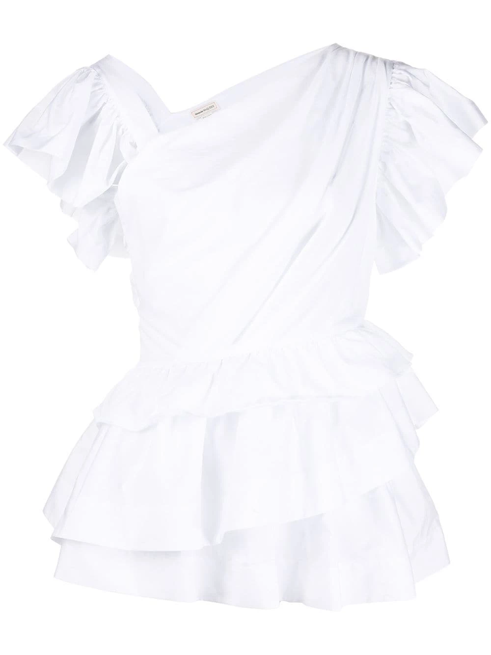 You’ll catch us wearing this white cotton v-side neck ruffled T-shirt from Alexander McQueen on a Friday night while sipping a Cosmopolitan and discussing Carrie’s best moments with our friends. Our favourite is when she fell during that fashion show – yes, our soul does not match our t-shirt. Featuring a ruffled hem, a fitted silhouette, ruffled short sleeves and a v-side neck.