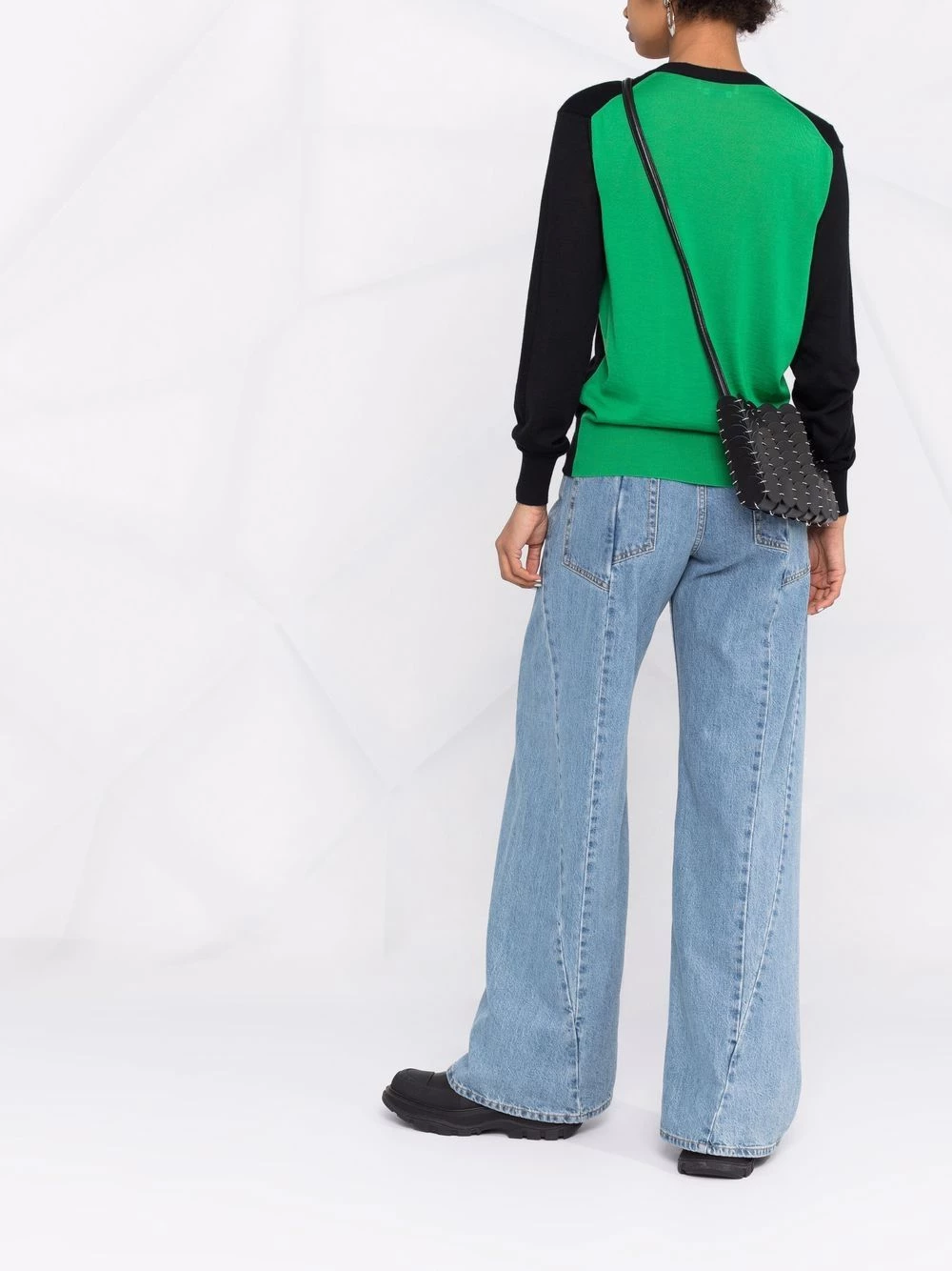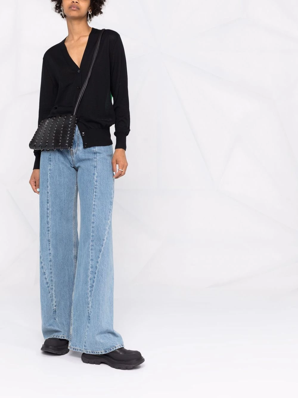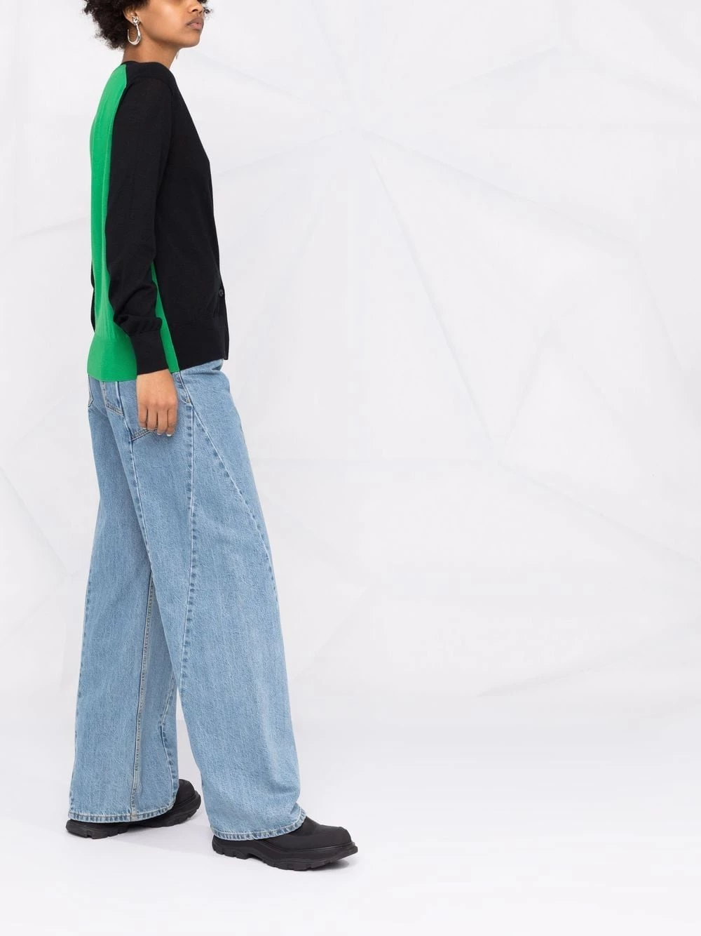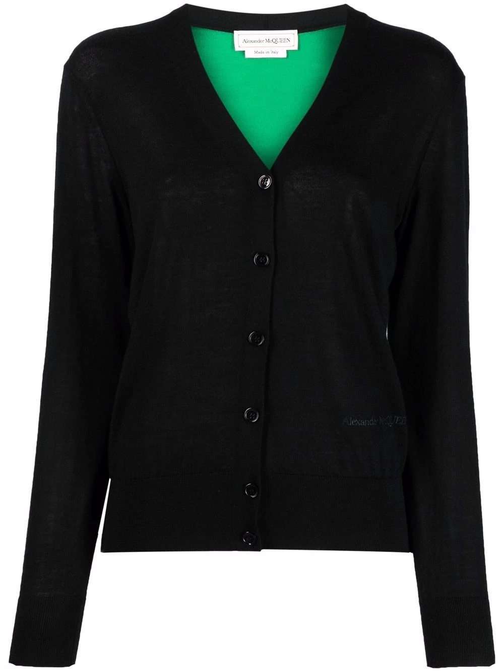 Alexander McQueen has always thrived on the unexpected, presenting unique pieces with a signature twist. Made from soft cashmere, this black V-neck cardigan is detailed with a subtle embroidered logo to the front and a bright green contrasting panel to the back.