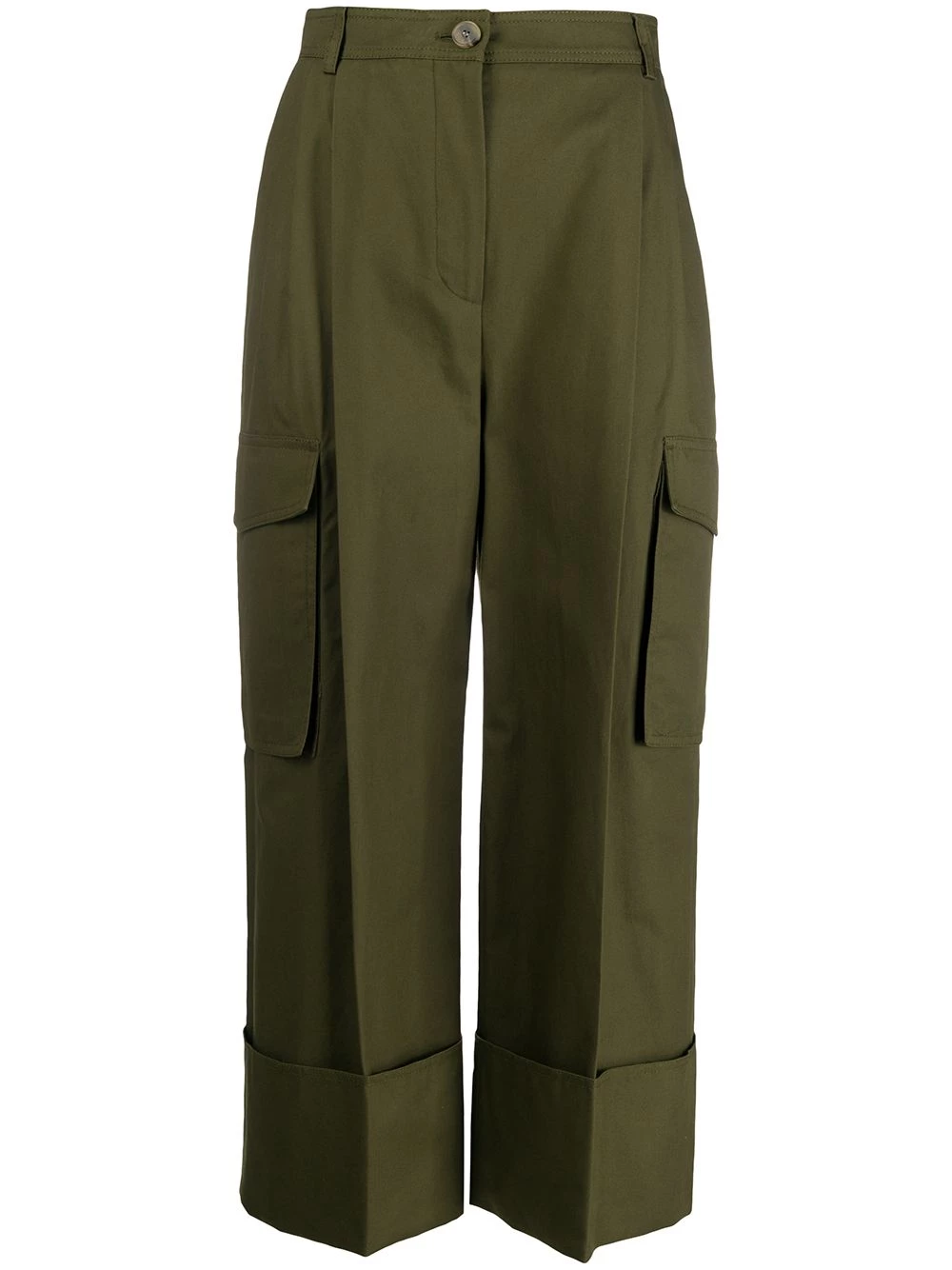 Alexander McQueen prioritise both style and practicality with khaki-green cotton cropped cargo trousers. Designed with large side flap pockets and turn-up hems, these straight-leg pair prove themselves as useful as they are aesthetically pleasing. Featuring a high waist, belt loops, a button fly fastening, side slit pockets, a back pocket, side flap pockets, turn up hems, a cropped length, and a straight leg.