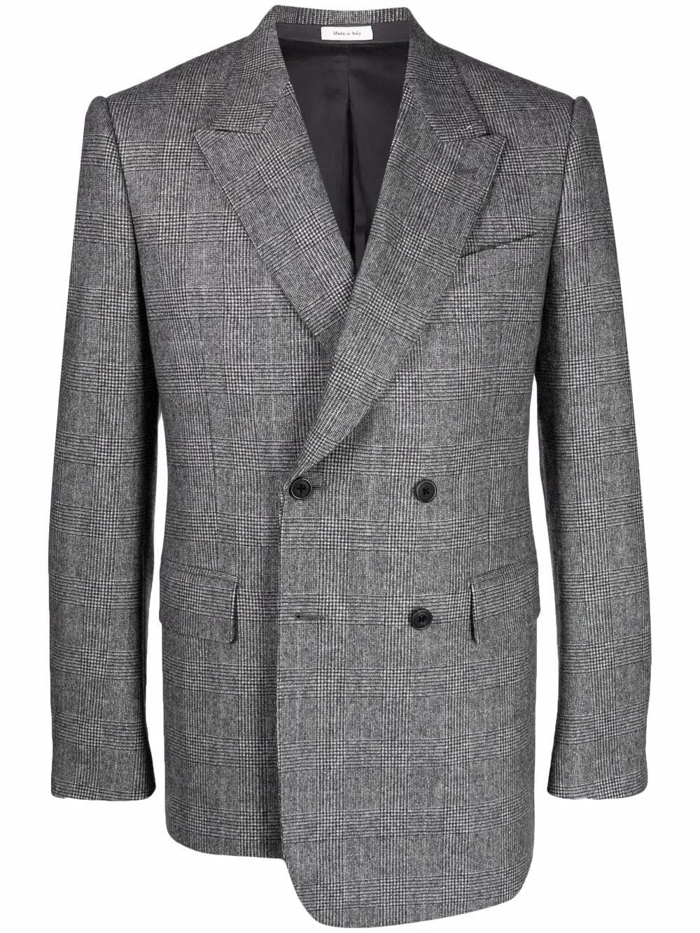 Classic tailoring is executed perfectly with Alexander McQueen’s double-breasted blazer jacket constructed from grey charcoal wool and showcasing a Prince of Wales check pattern. Whilst a contemporary twist is added with an asymmetric hem creating a slanted silhouette.