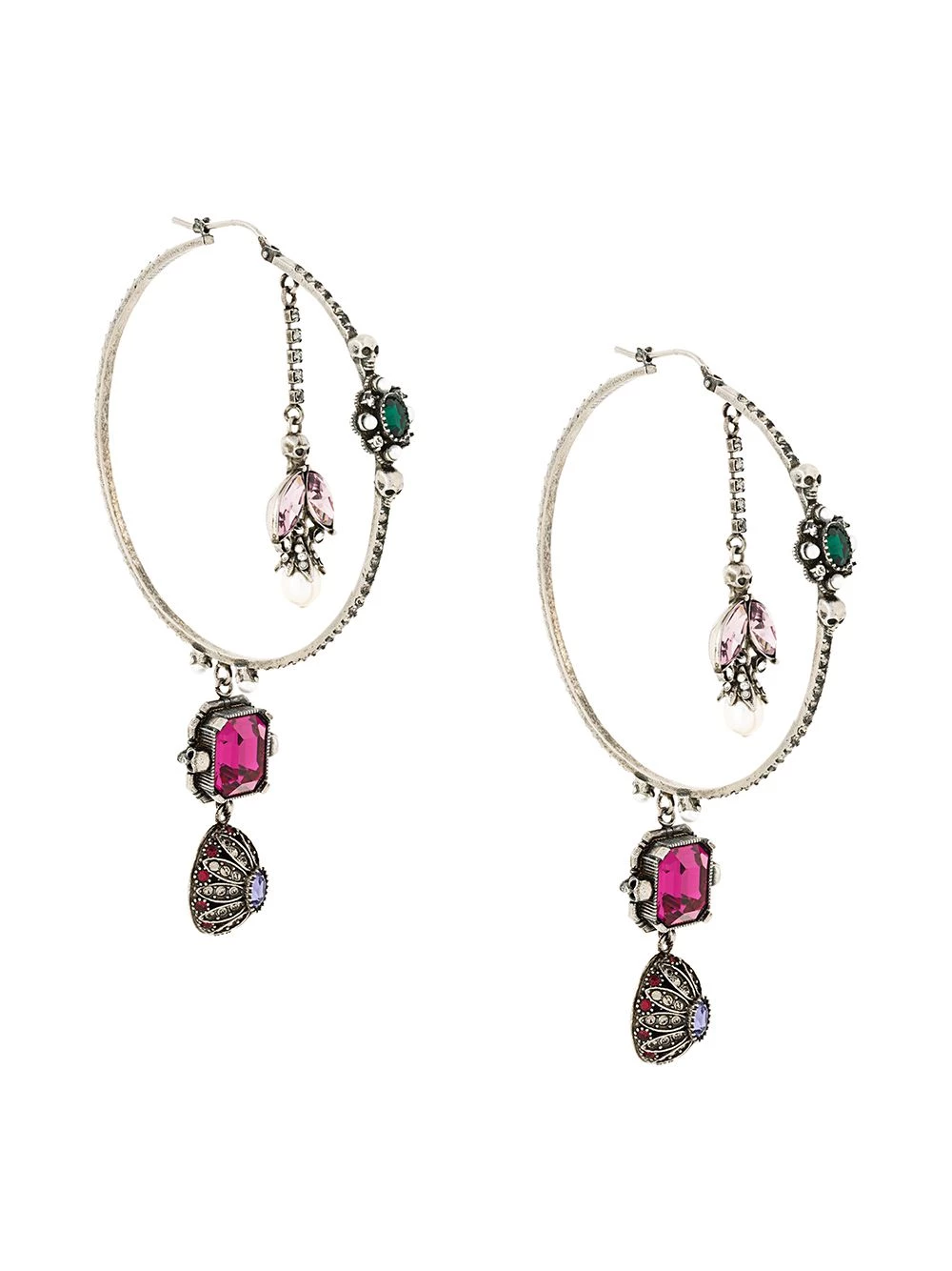 Discover the darkly alluring aesthetic of Alexander McQueen in the SS17 collection. Theatrical designs feature intricate, opulent detailing and gothic motifs. This silver-tone brass embellished hoop earrings feature Swarovski crystals, dangling charms and pearl embellishments. These earrings come as a pair.