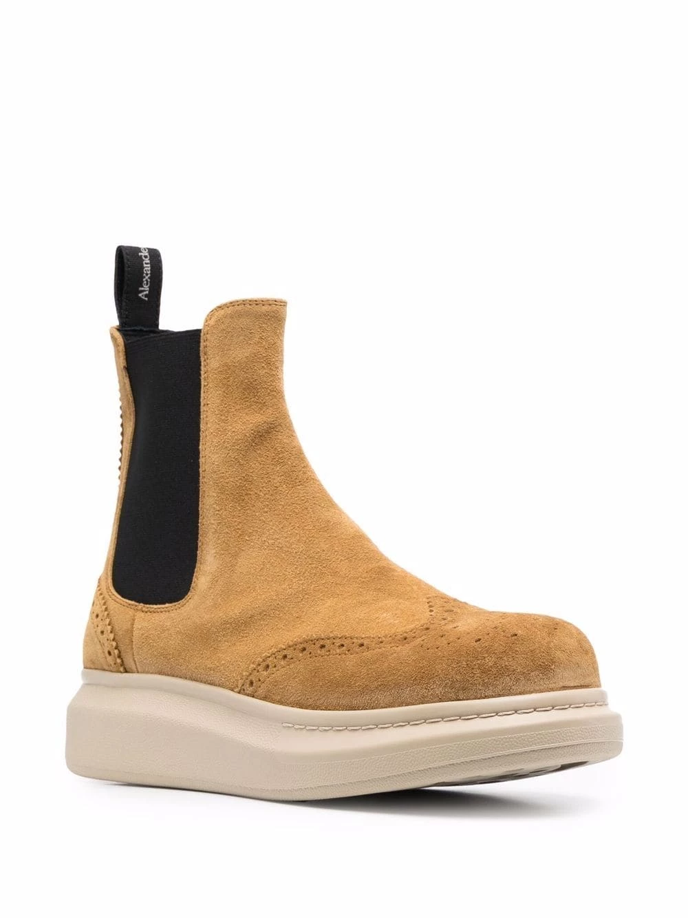 Alexander McQueen continues with the oversized sole theme, applying it to these Hybrid Chelsea boots. Crafted from suede, this pumped-up pair has been detailed with brogue-style perforations and a logo-detailed pull tab for a distinctive aesthetic. Elevate your look…literally.