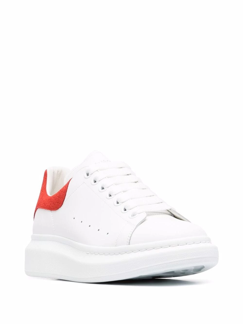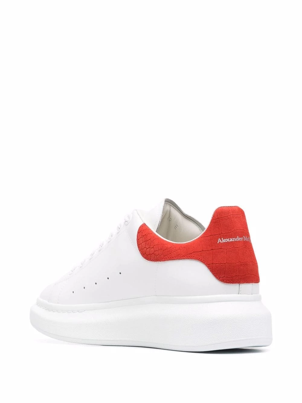 First introduced during SS15, Alexander McQueen’s Oversize sneakers remain a signature silhouette for the label. Dressed here in a white and fiery orange hue, these calf leather sneakers feature a crocodile embossed logo heel counter and sit atop the signature chunky outsole.
