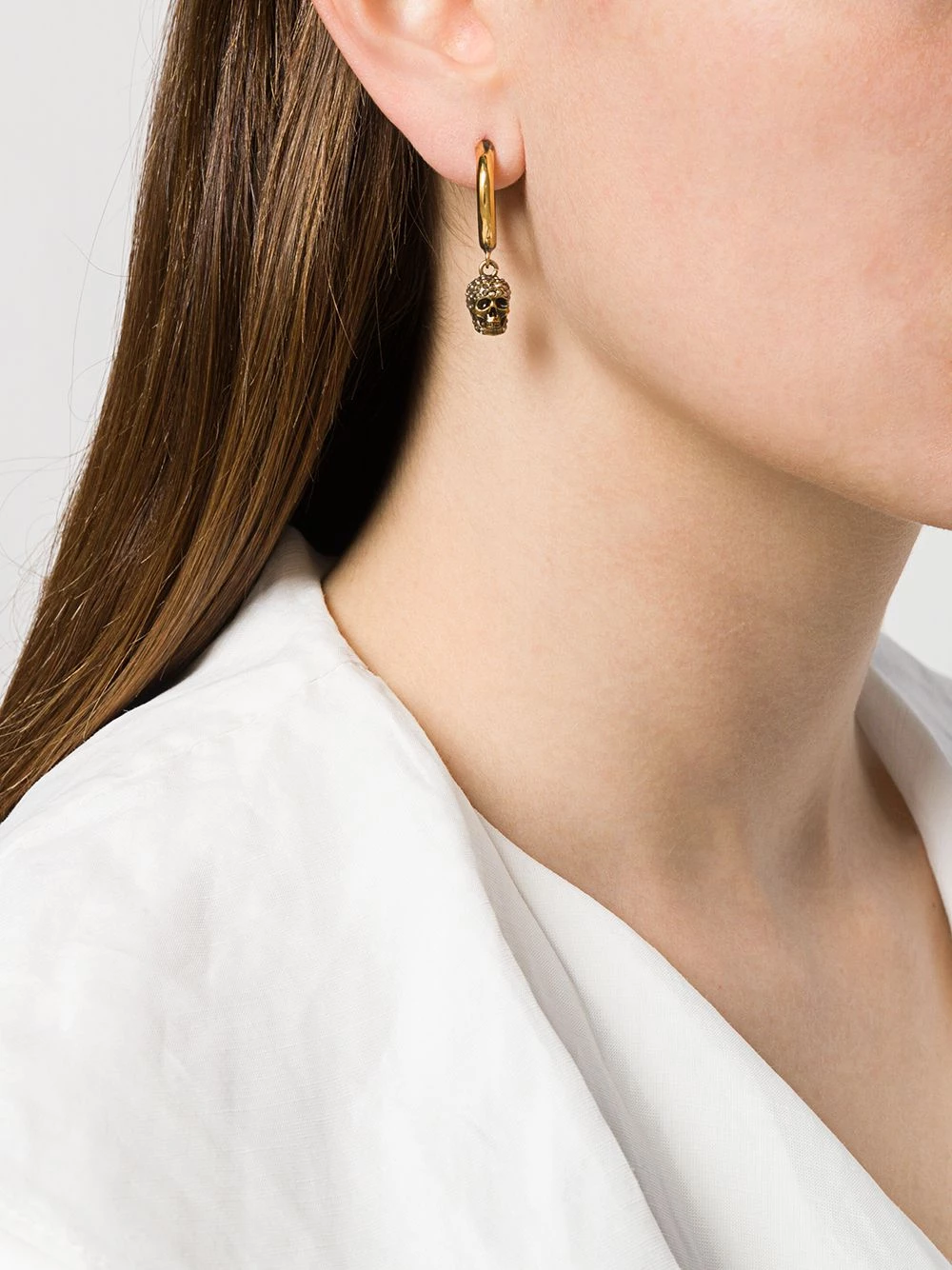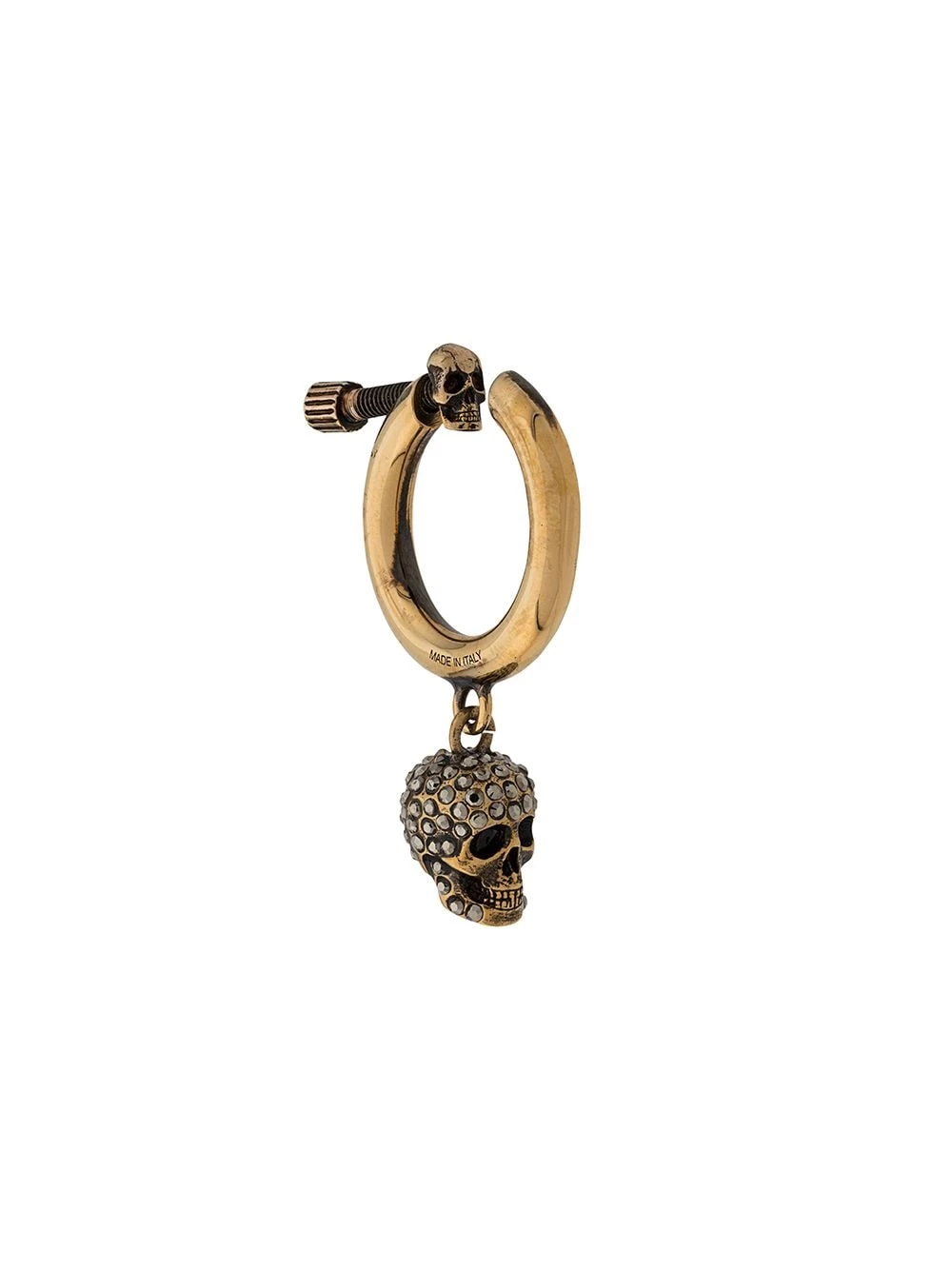 Discover the darkly alluring aesthetic of Alexander McQueen in the latest collection. Theatrical designs feature intricate, opulent detailing and gothic motifs – as showcased by this brass skull drop earring. Featuring a post back closure and crystal embellishments. This is a single earring.