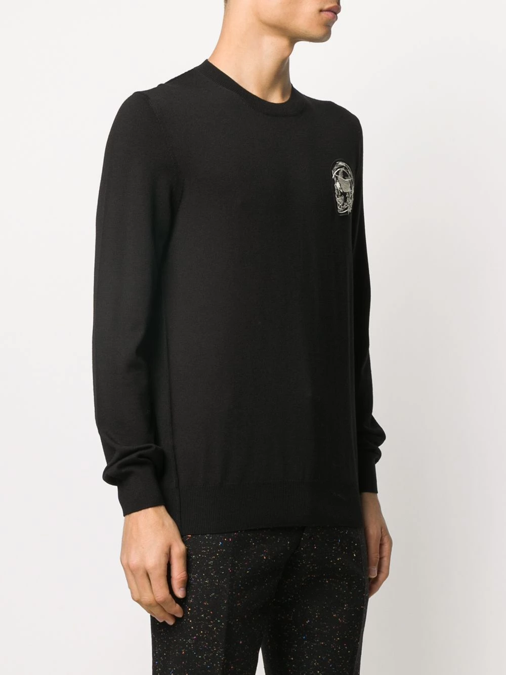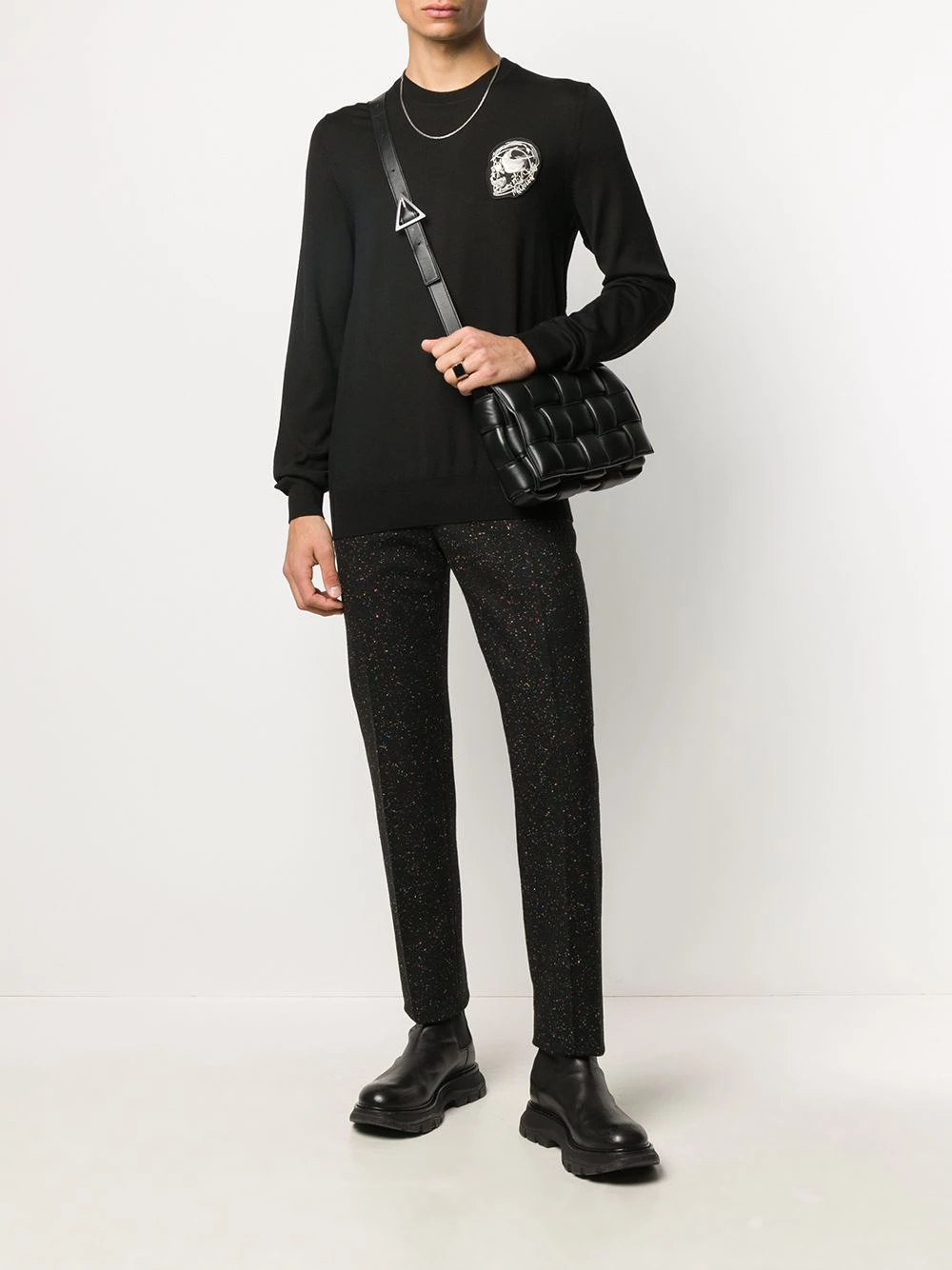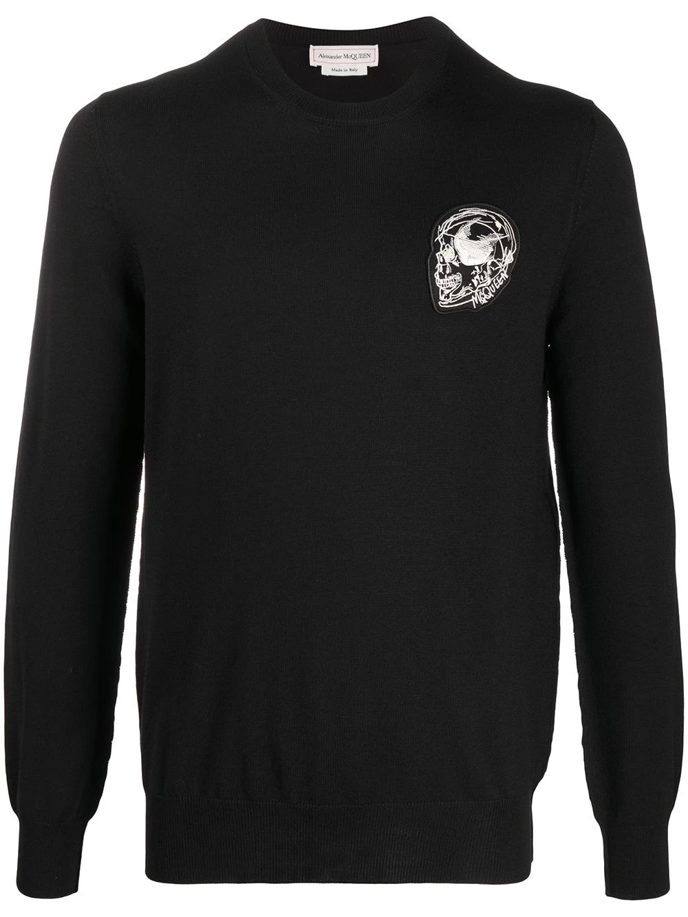 No skeletons in your closet, just skulls. In true Alexander McQueen style, this black wool jumper is embellished with a skull patch at the chest. Make space in your knitwear collection.