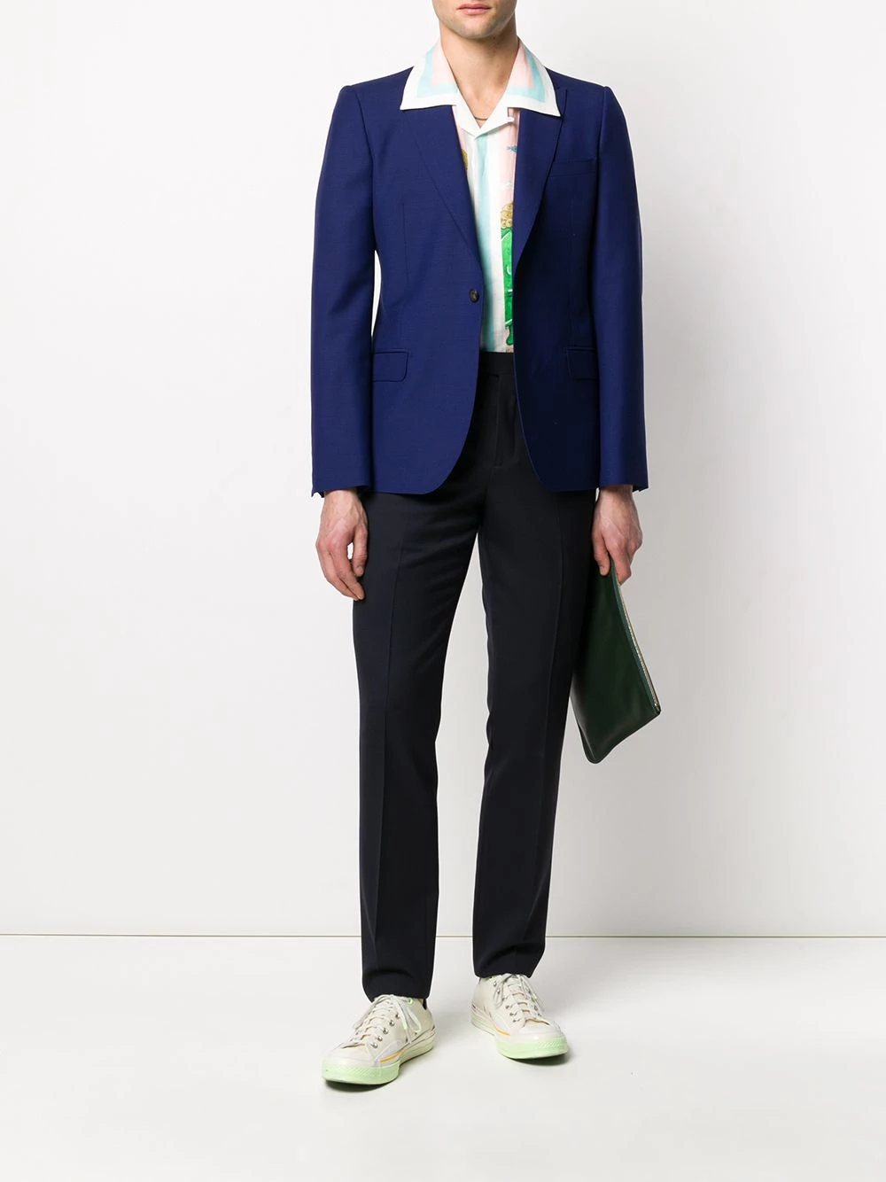 Fashion quiz: how many pieces does it take for you to get full attention on tomorrow’s presentation? Apparently, one will be enough. As long as that one is this indigo-blue mohair-wool blend slim-fit single-breasted blazer from Alexander McQueen, all eyes will be on you. Not for the nice PowerPoint, though. Featuring peaked lapels, a chest pocket, a front button fastening, front flap pockets, a rear central vent, long sleeves, button cuffs and a slim fit.