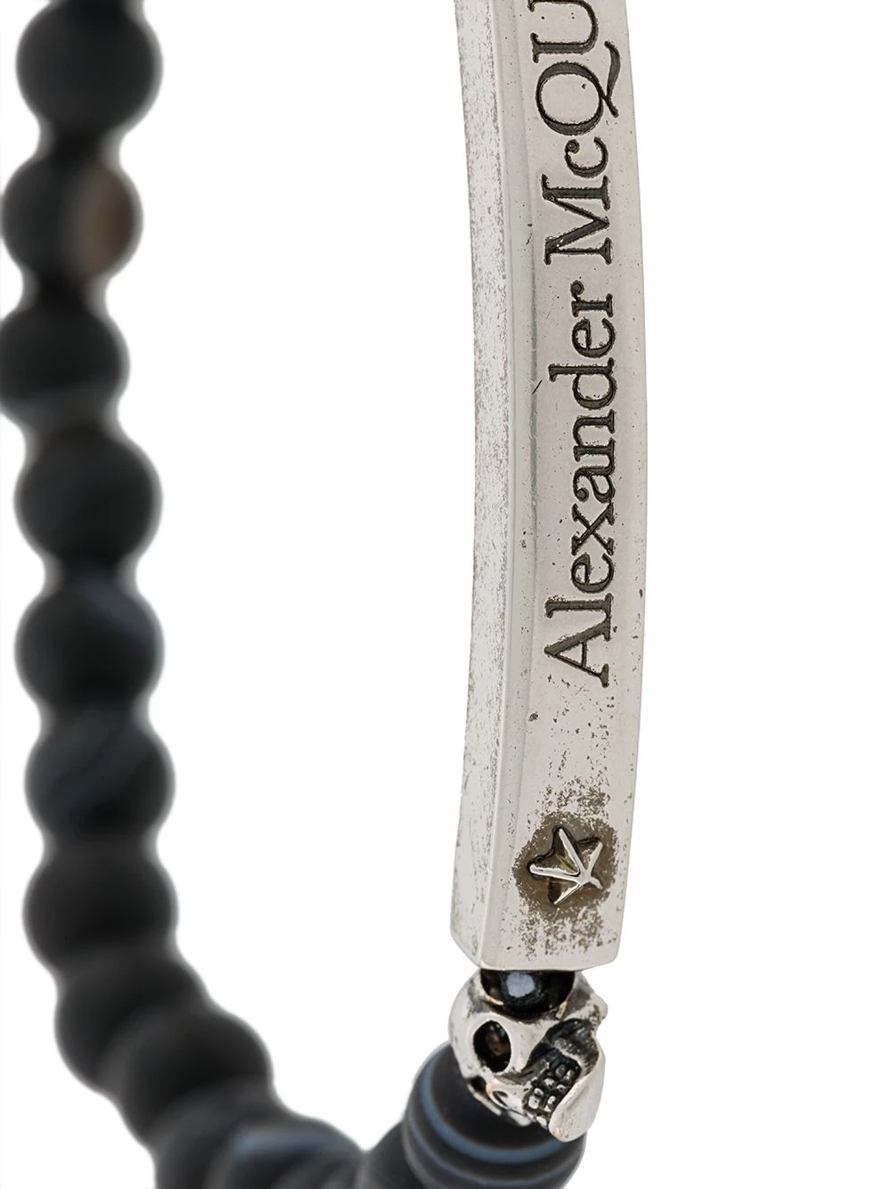 Home to the edgy and mysteriously alluring, Alexander McQueen is an encounter of finesse and duskiness. This black silver agate beaded bracelet from Alexander McQueen features silver plating, an engraved logo and a bead chain.