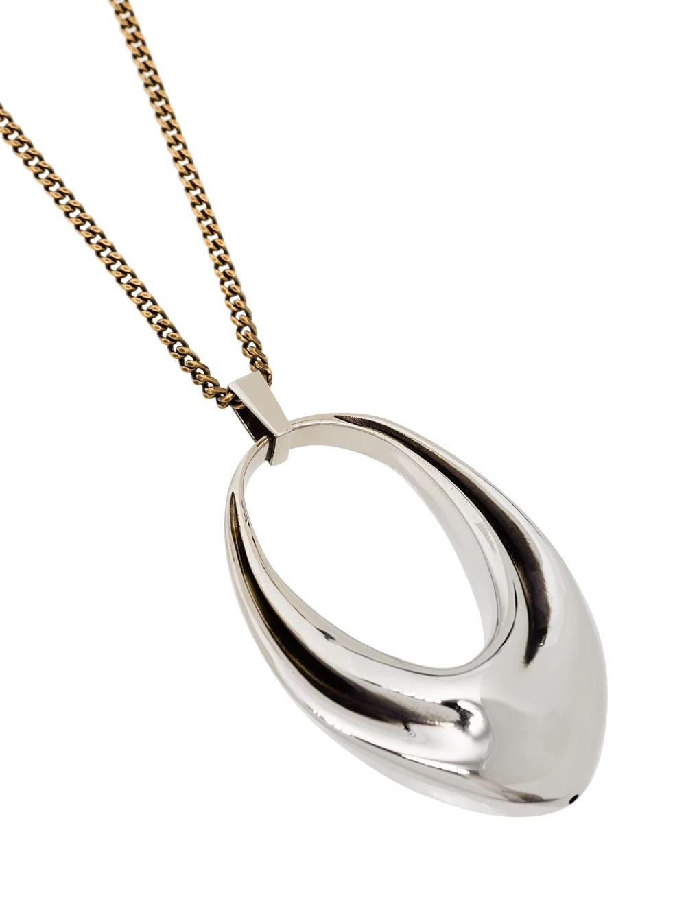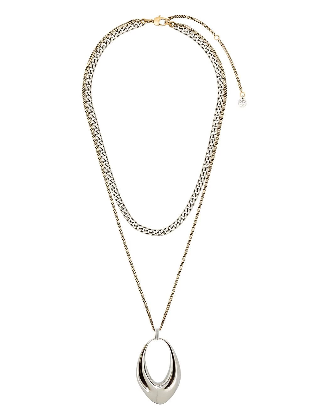 Leave it to Alexander McQueen to add some drama to your looks. In a two-tone design, this necklace features a statement pendant hanging from two chains, creating a layered effect. Two for one.
