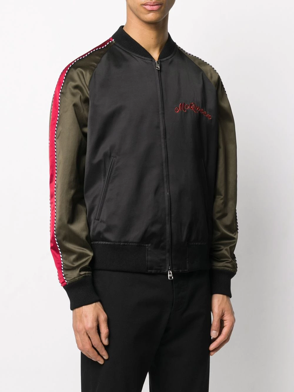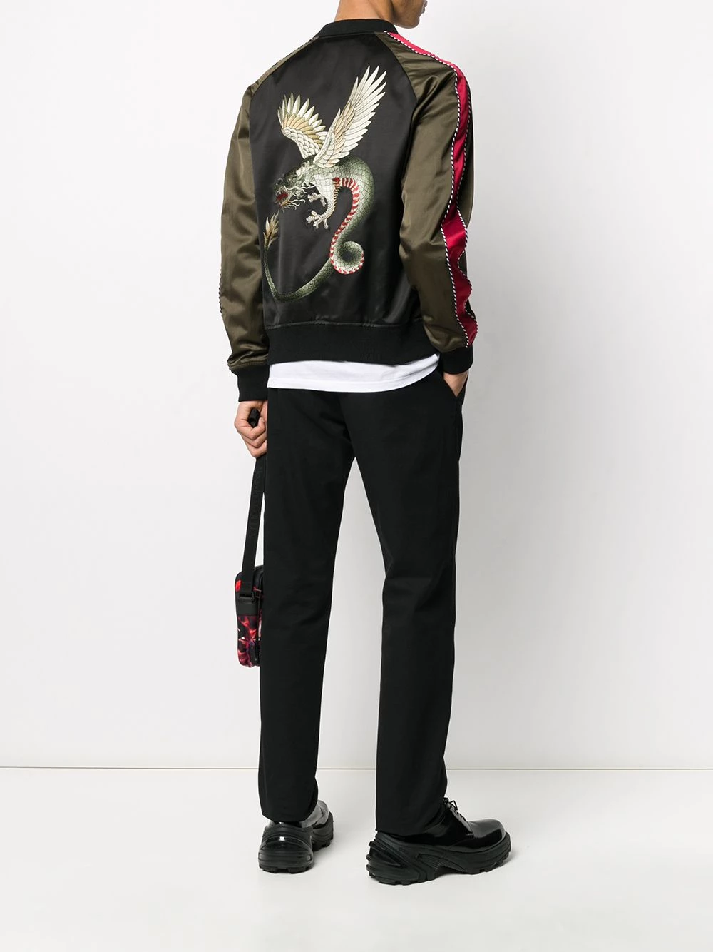 It’s all in the details. And this embroidered Alexander McQueen jacket does details exceptionally well. All eyes on you. Featuring a ribbed stand up collar, a front zip fastening, a logo to the chest, side slit pockets, panelled long sleeves, a ribbed hem and cuffs and an embroidered dragon.