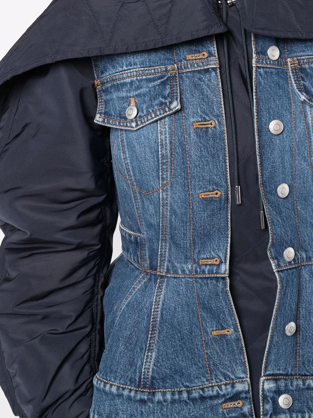 A signature piece from Alexander McQueen’s AW21 presentation, this multi-faceted peplum jacket is detailed with bomber and denim fabrications. Punctuated by bishops sleeves and an oversized foldover collar, the striking design shows off McQueen’s tailoring mastery.