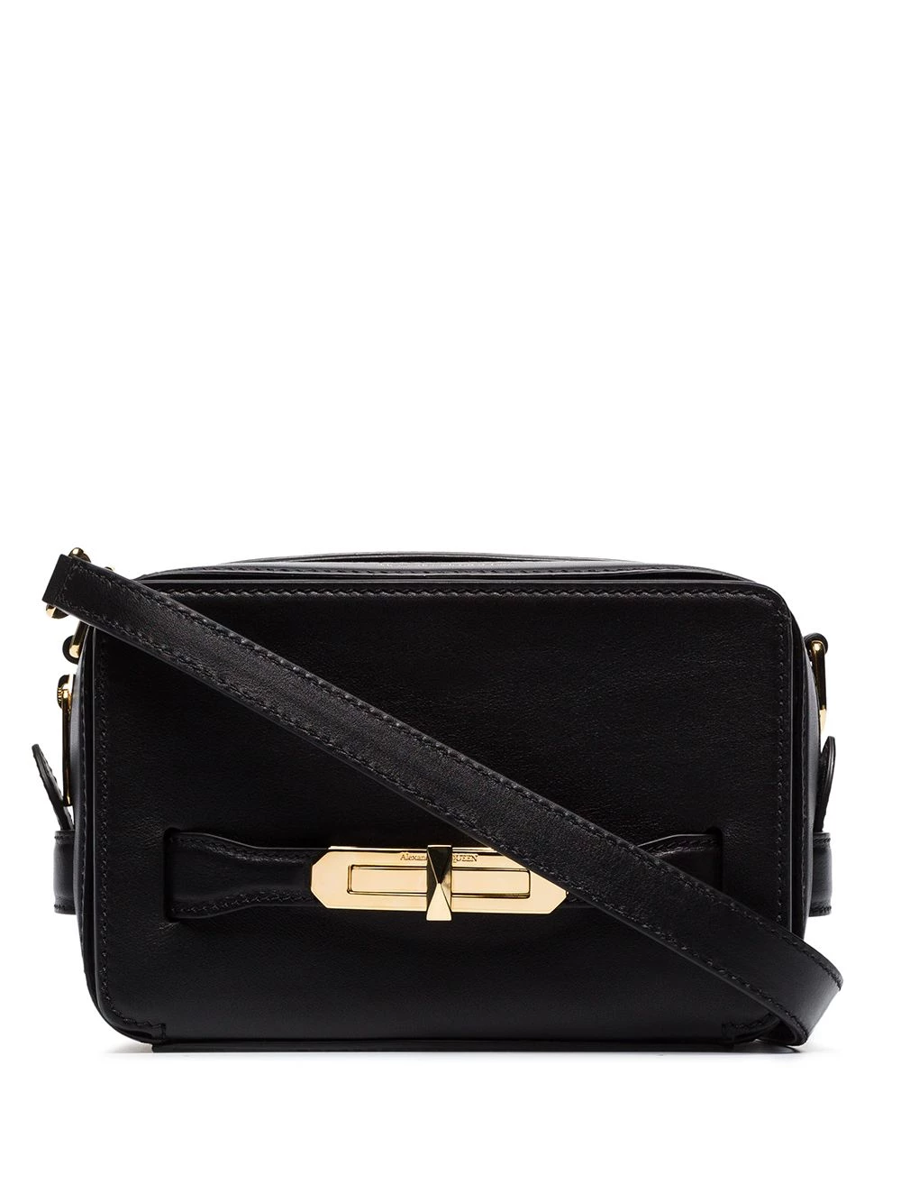 Didn’t you know that a lady’s outfit is never complete without a beautiful bag across the shoulder? Alexander McQueen presents this black leather lock camera bag as a perfect companion as you head out the door for the day and can carry all your daily essentials with some extra space for treats too. Featuring a detachable and adjustable shoulder strap, a smooth surface with a matte finish, a printed logo, an engraved logo, a gold-tone twist lock fastening and a top zip closure.