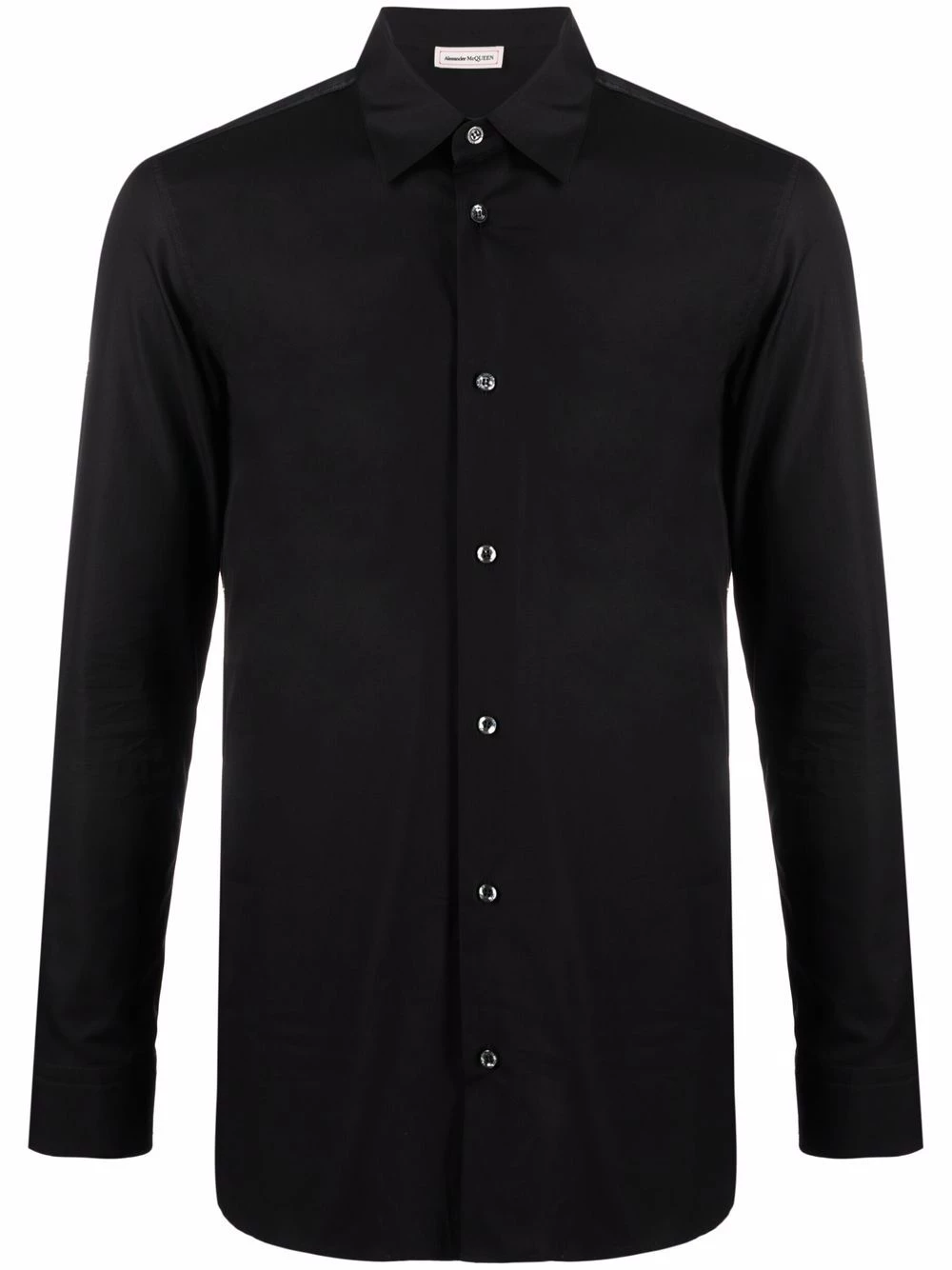 Alexander McQueen leaves no one in doubt where this long-sleeve shirt is from. Decorated with a logo patch to the back of the neck, this black tailored top proudly showcases its origins.