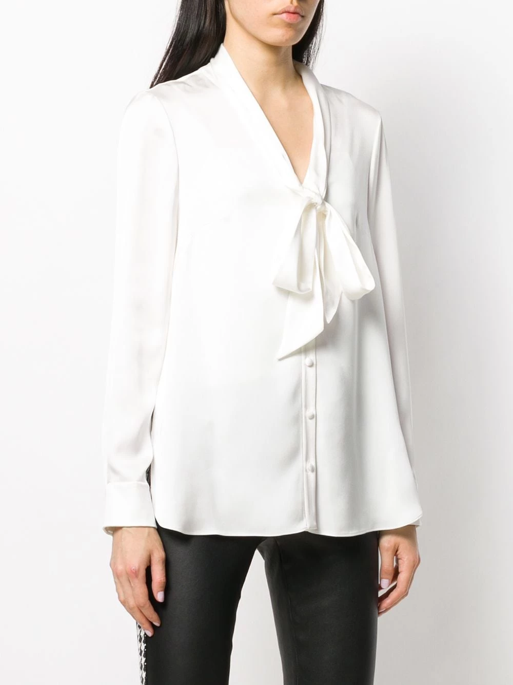 Alexander McQueen replaces gothic, dark romanticism for classic feminine designs in the new AW19 collection, as showcased by this white silk pussy bow shirt. Featuring a pussy bow fastening, a front button fastening and long sleeves.