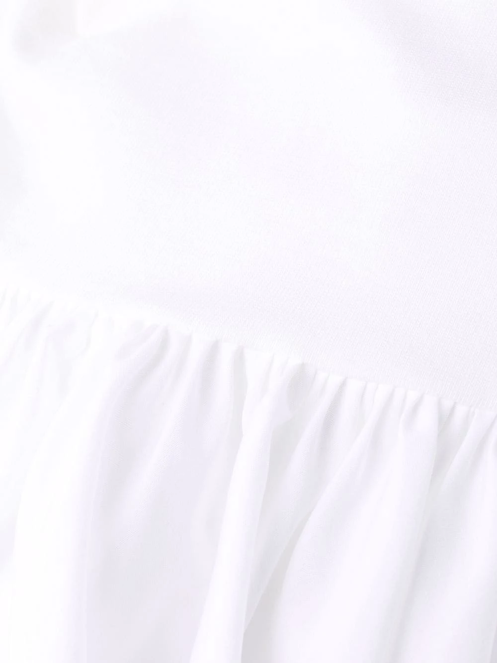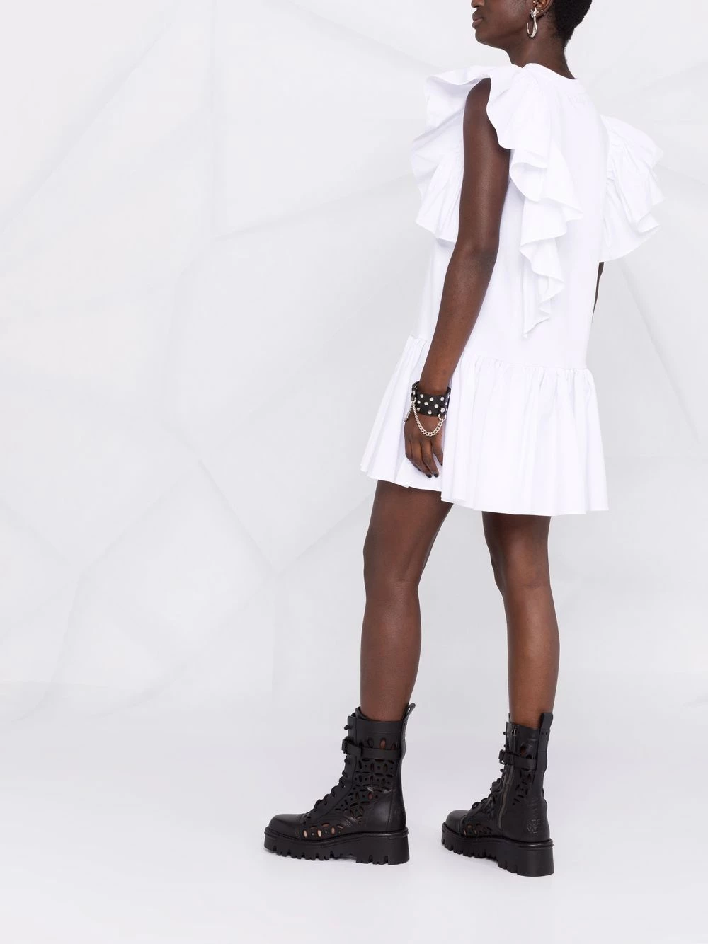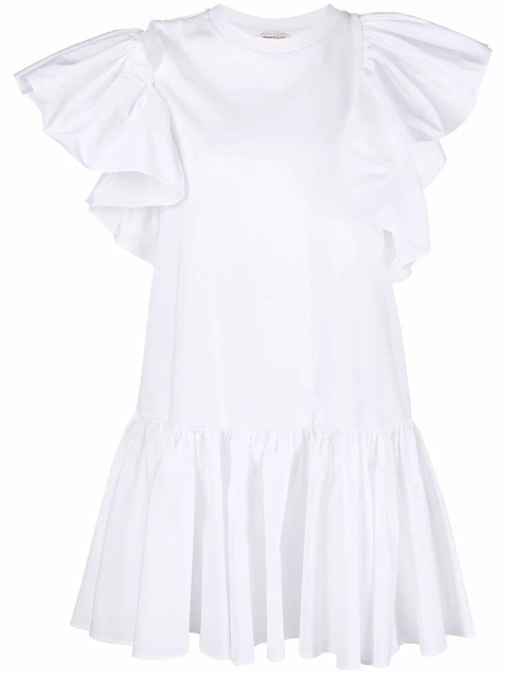 Detailed with gentle ruffles and a small cut-out detail on a single shoulder, this white cotton dress from Alexander McQueen falls to a playful short length.