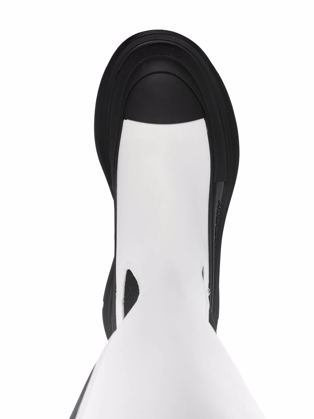 Alexander McQueen’s Tread Slick boots borrow design elements from utilitarian styles. Free from decoration, this two-tone design is defined by the chunky rubber soles that temper the fitted silhouette the elasticated panels offer.